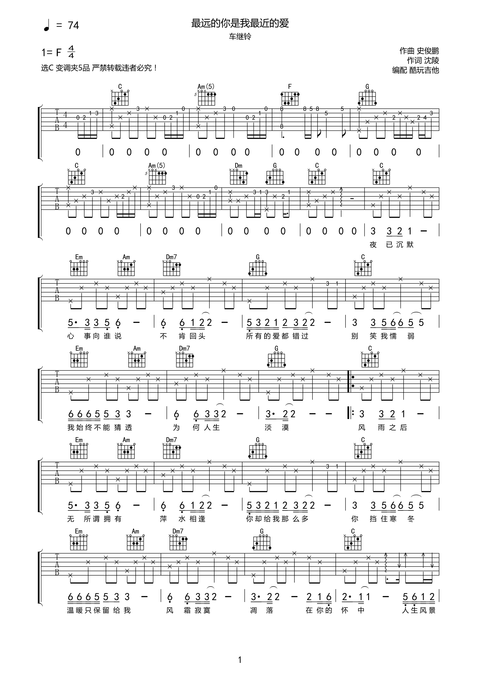吉他车继玲《最远的你是我最近的爱》吉他谱-C调弹唱谱六线谱