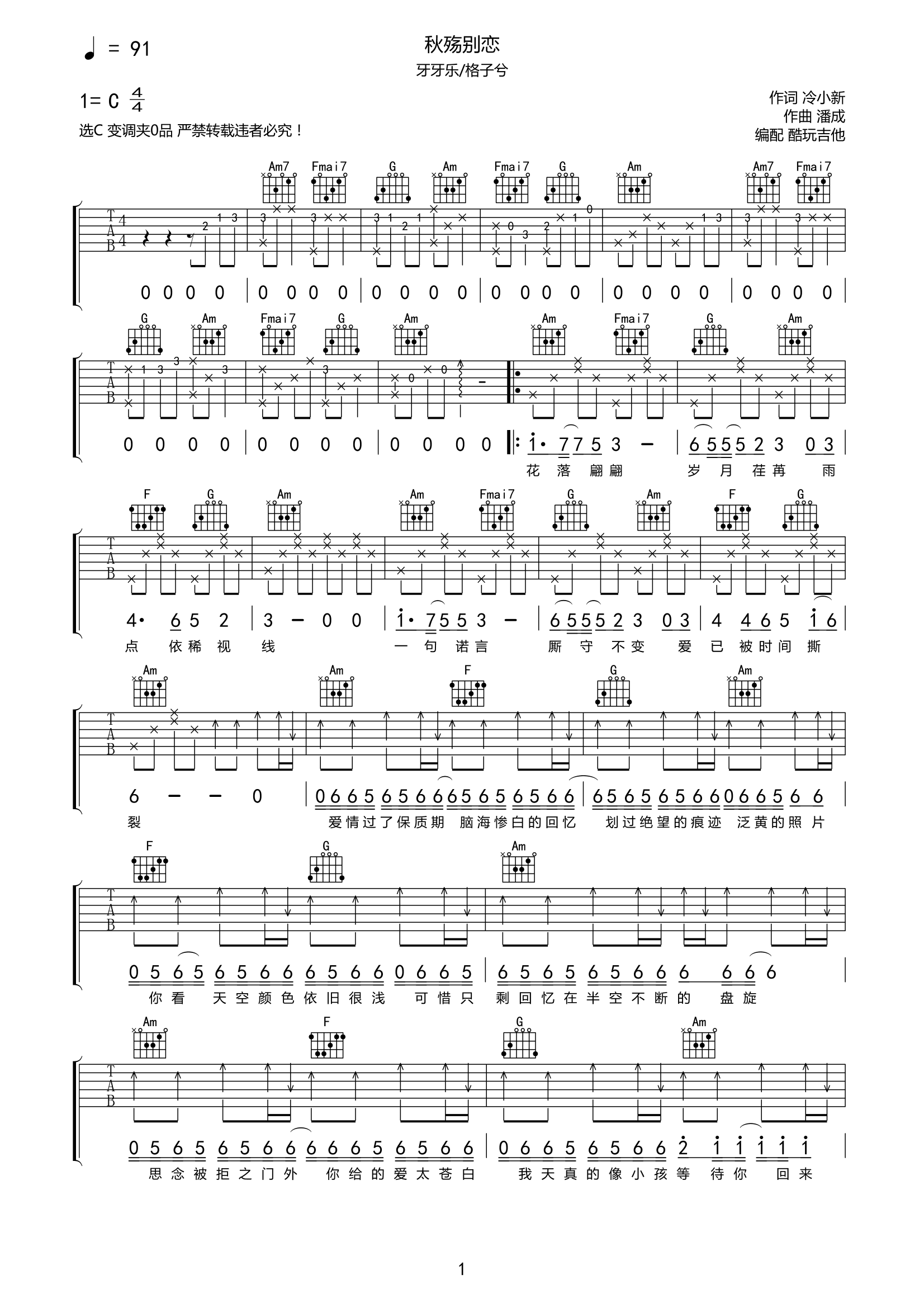 牙牙乐/格子兮《秋殇别恋》吉他谱-C调弹唱谱六线谱...