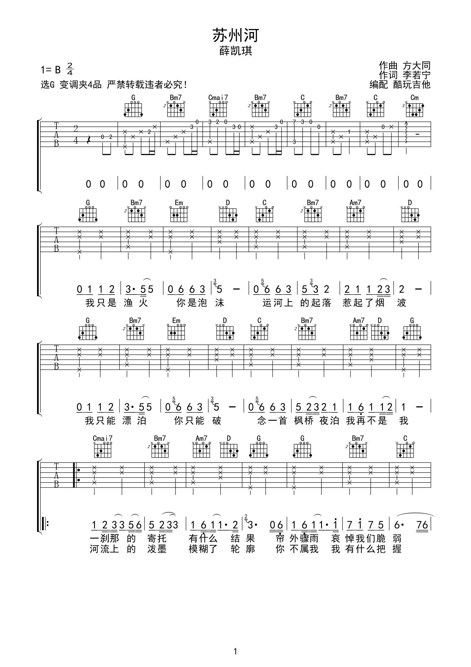 吉他薛凯琪《苏州河》吉他谱-G调弹唱谱六线谱