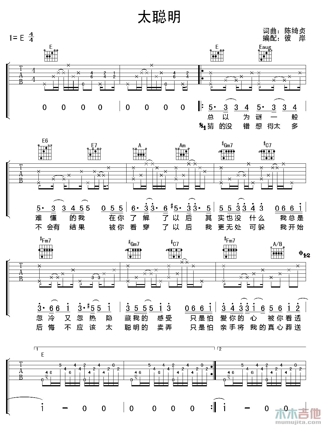 吉他陈绮贞《太聪明》吉他谱 E调女生版