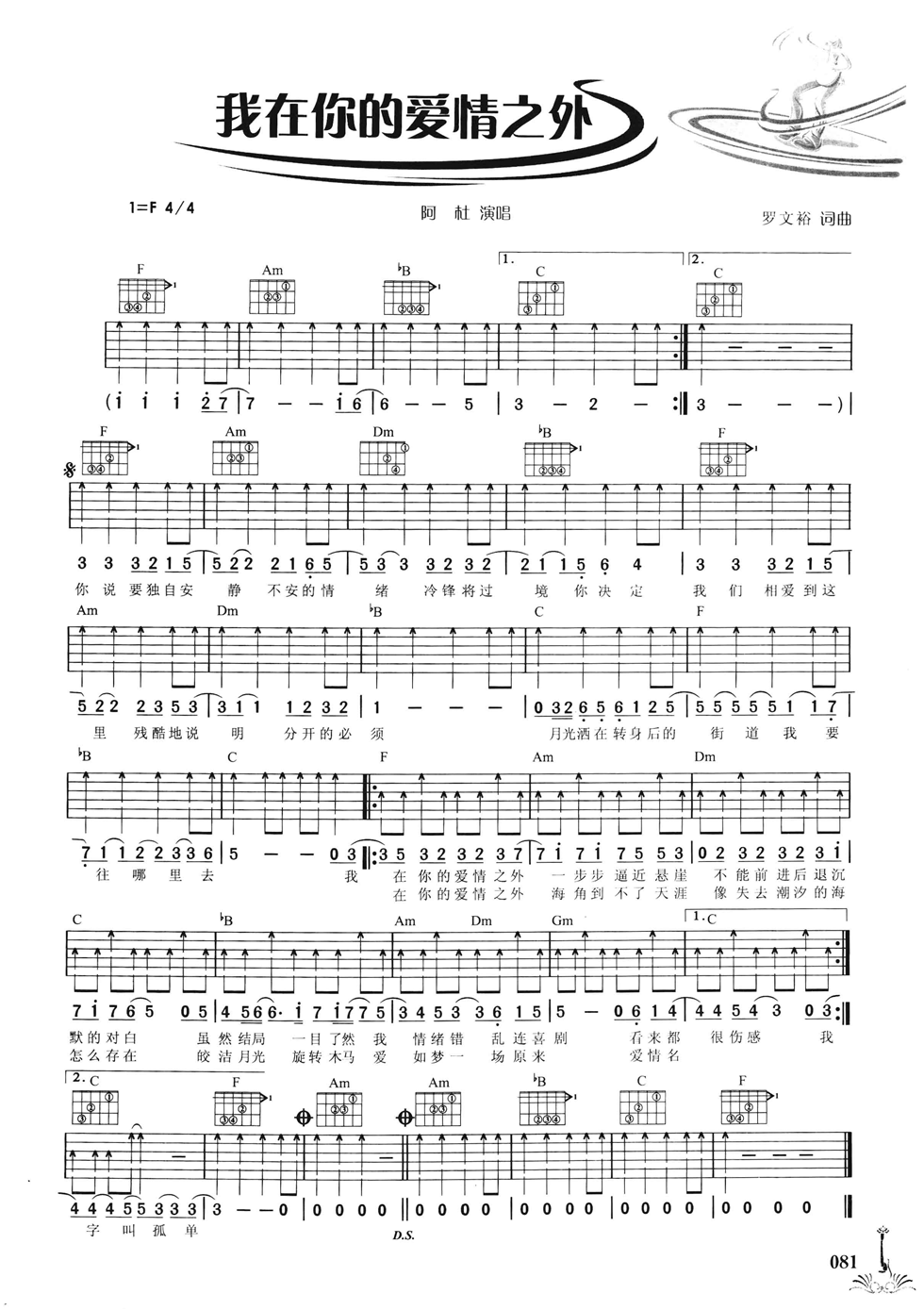 吉他阿杜《我在你的爱情之外》吉他谱 F调六线谱