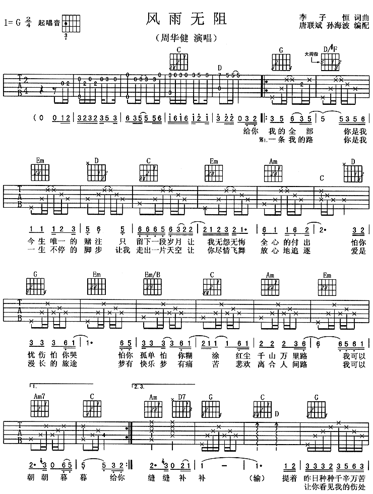 吉他周华健《风雨无阻》吉他谱 G调六线谱
