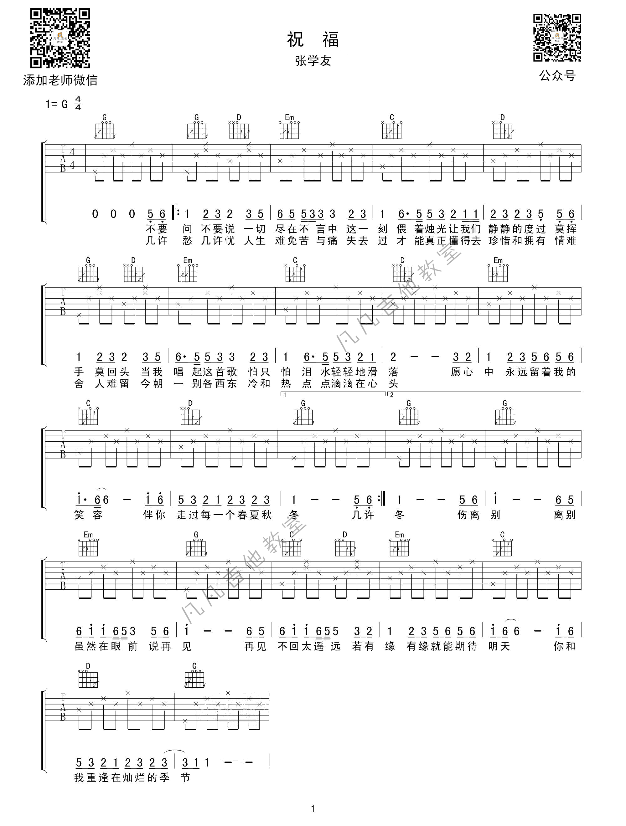 吉他_张学友《祝福》吉他谱 G调高清版_凡凡吉他教室编配