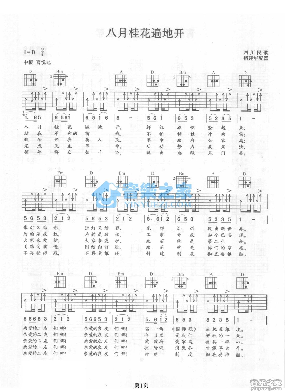 D调版四川民歌《八月桂花遍地开》吉他弹唱六线谱...