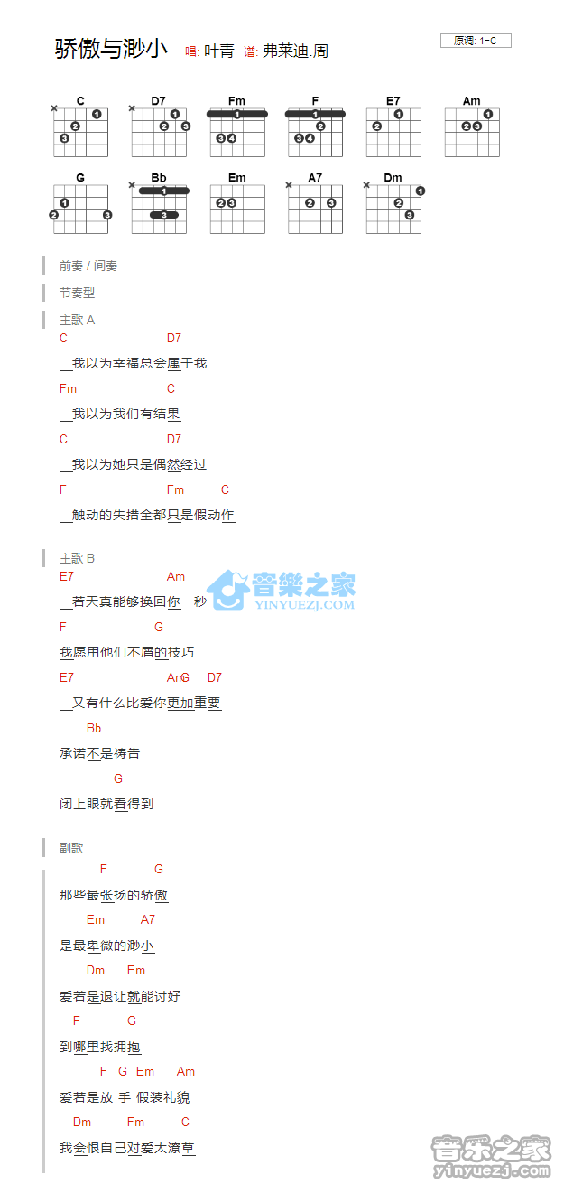 C调版《骄傲与渺小》吉他和弦弹唱谱...