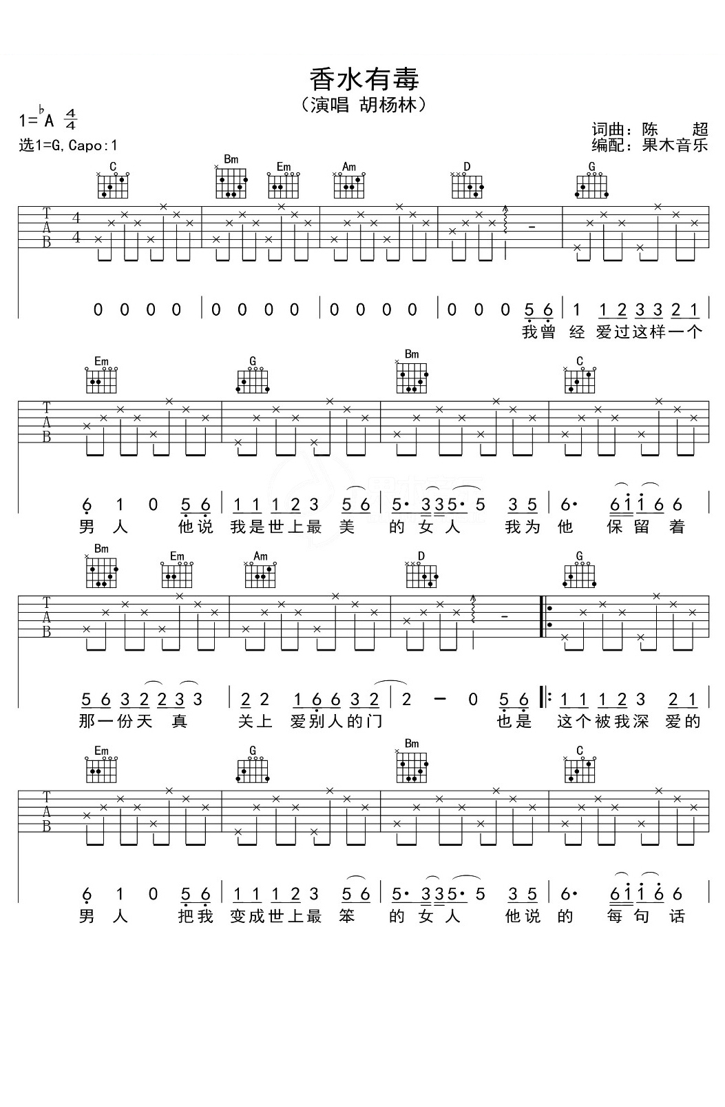 吉他胡杨林《香水有毒》吉他谱_吉他弹唱谱_果木音乐编配
