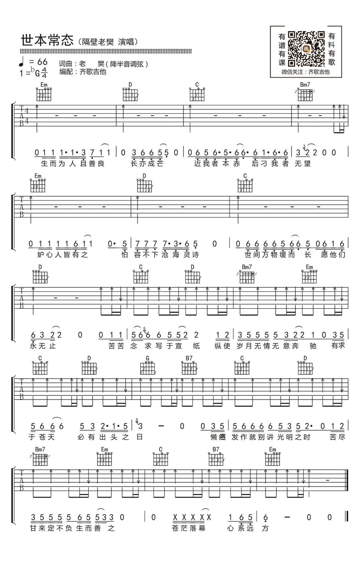 世本常态吉他谱,继《姬和不如》之后,隔壁老樊的新曲,降G调降半音调弦,嗓音浑厚而略带沙哑歌声,将一词一句轻轻雕刻于听者的心头,褒奖有求于苍天而又努力之人,贬斥那些有着嫉妒之心却又懒癌发作之人,人生道理早已尽数藏于歌中。...