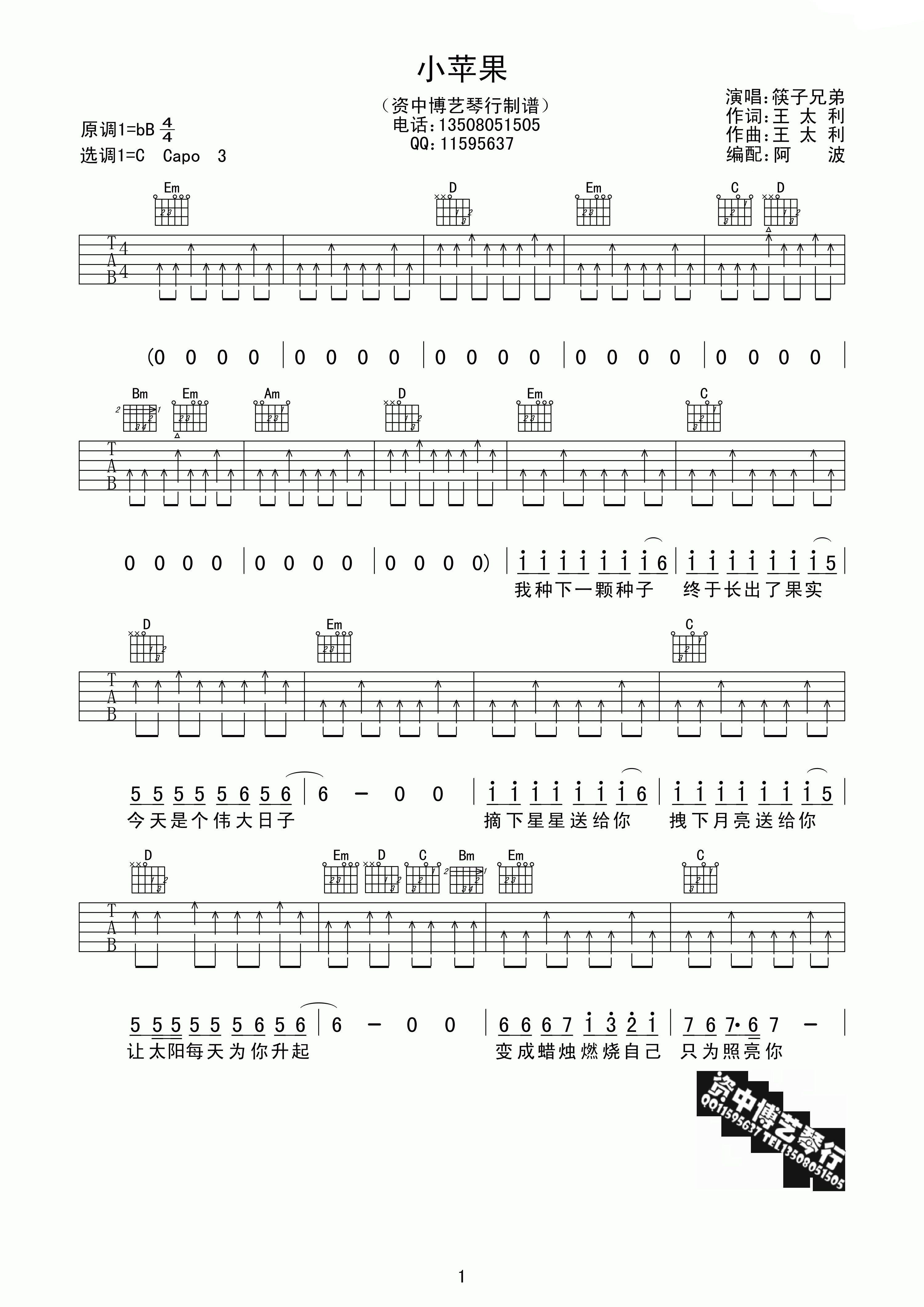 筷子兄弟《小苹果》吉他谱C调扫弦版...