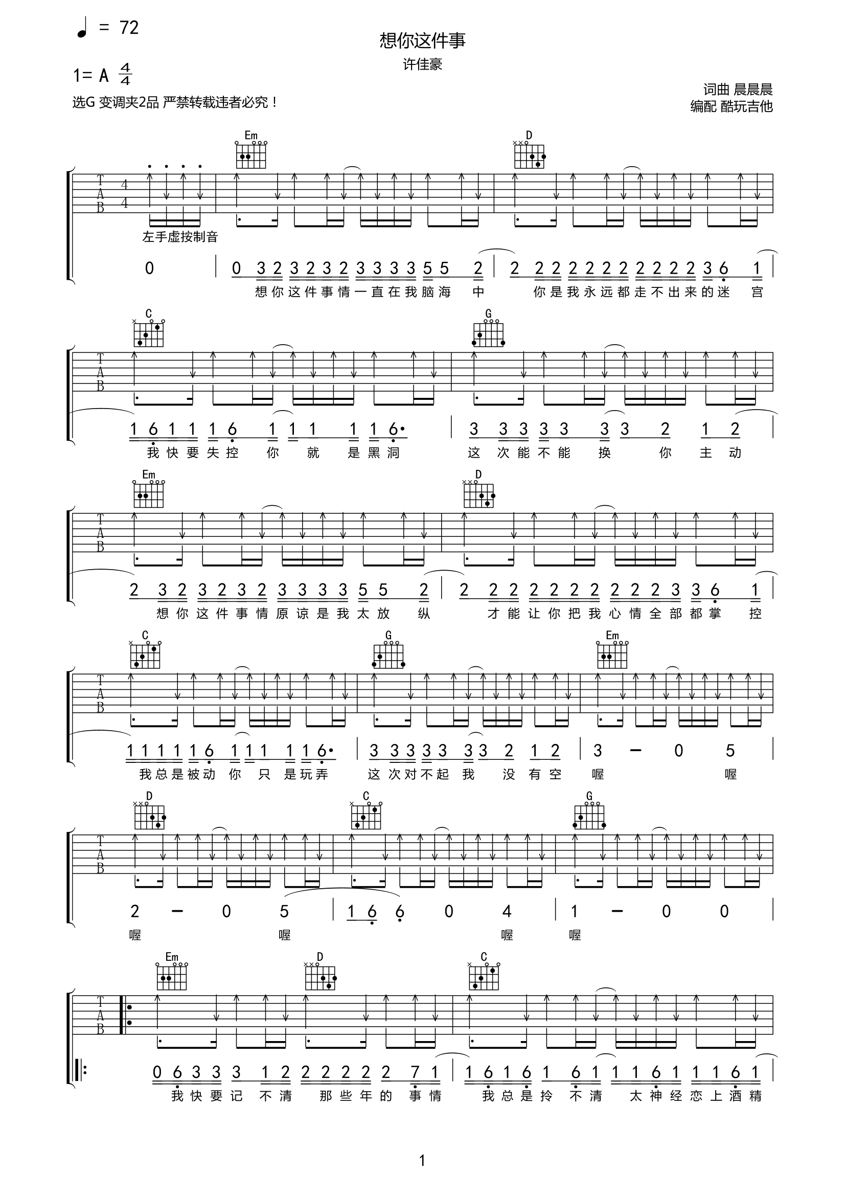 许佳豪《想你这件事》吉他谱-G调六线谱弹唱谱共2页免翻页...