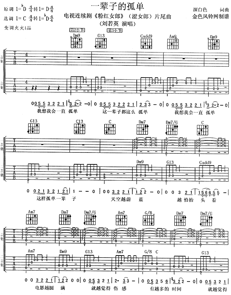 刘若英《一辈子的孤独》吉他谱C调附前奏...