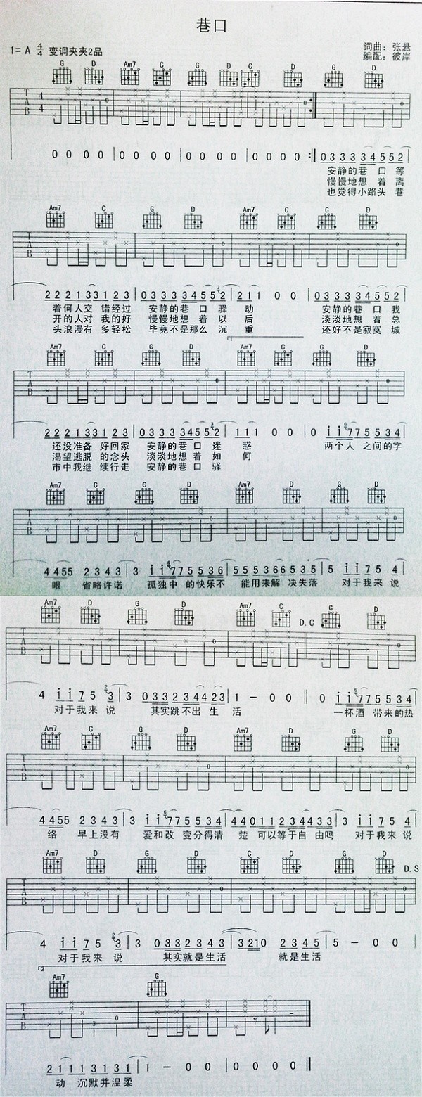 吉他张悬《巷口》吉他谱 A调六线谱
