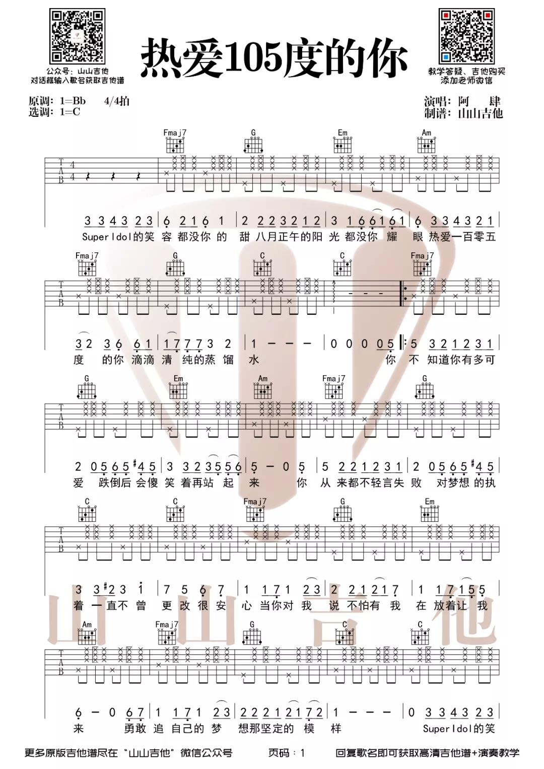 吉他阿肆_《热爱105度的你》_吉他谱_山山吉他