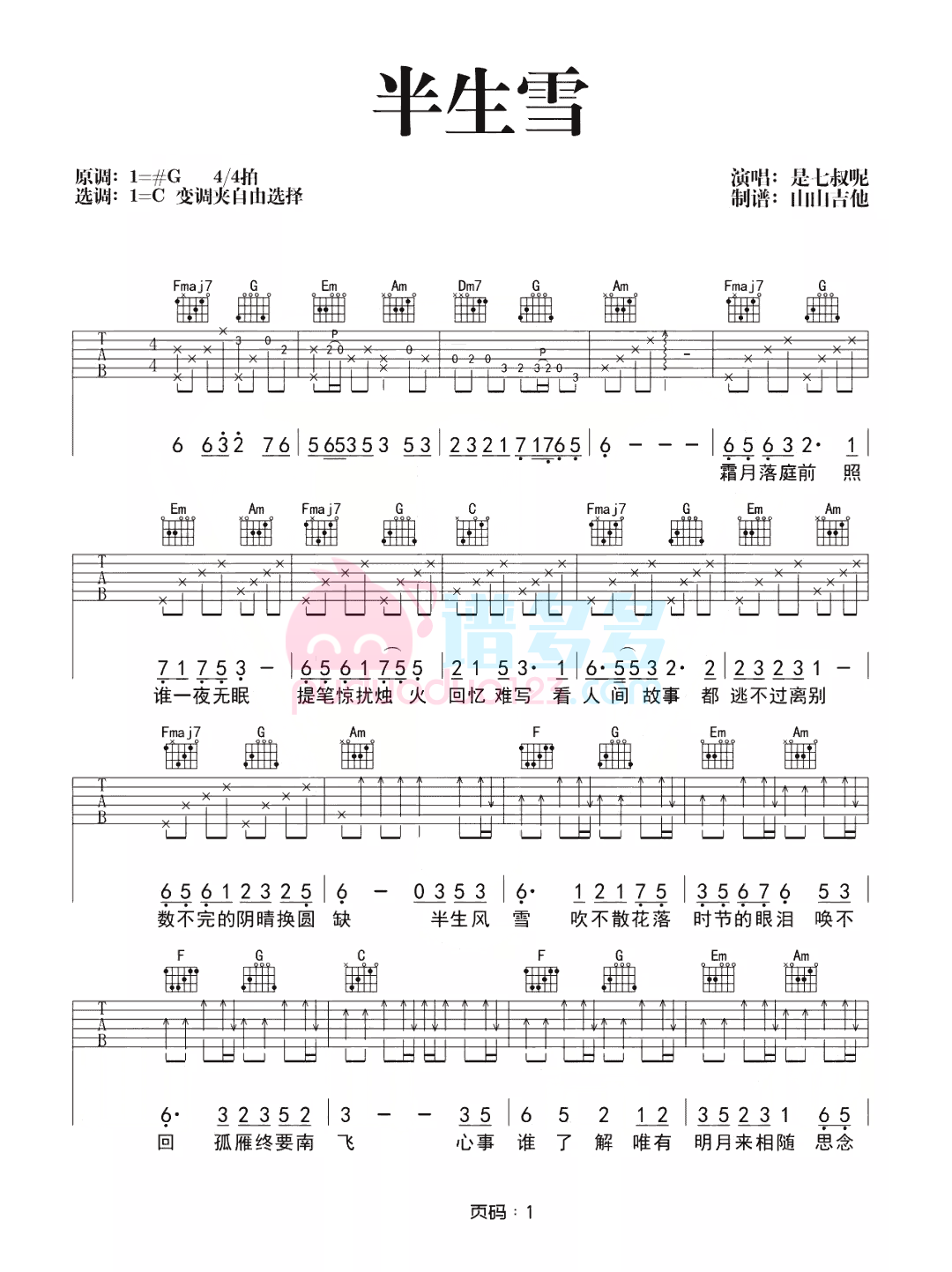吉他是七叔呢《半生雪》吉他谱C调原版