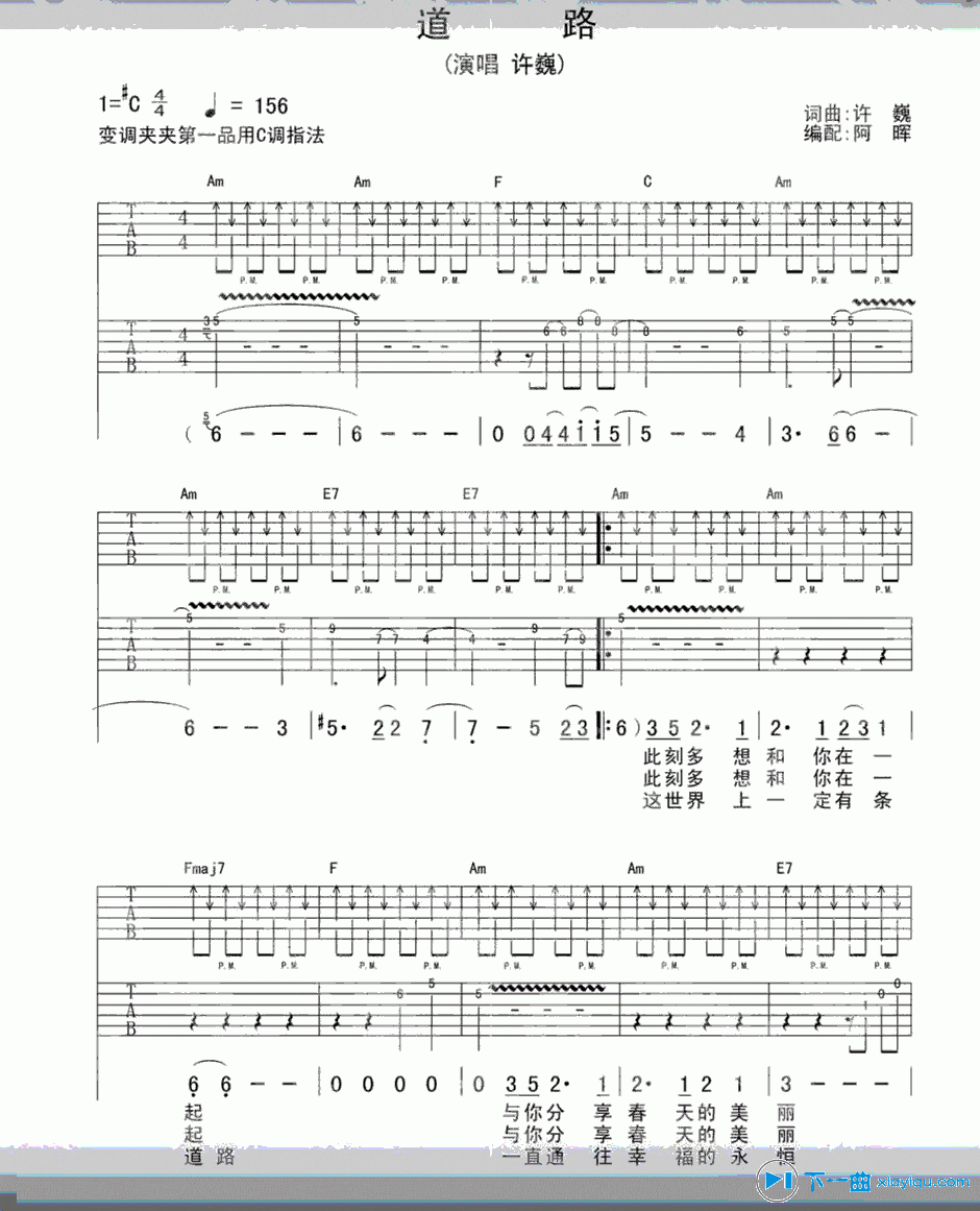 吉他许巍《道路》吉他谱C调扫弦版