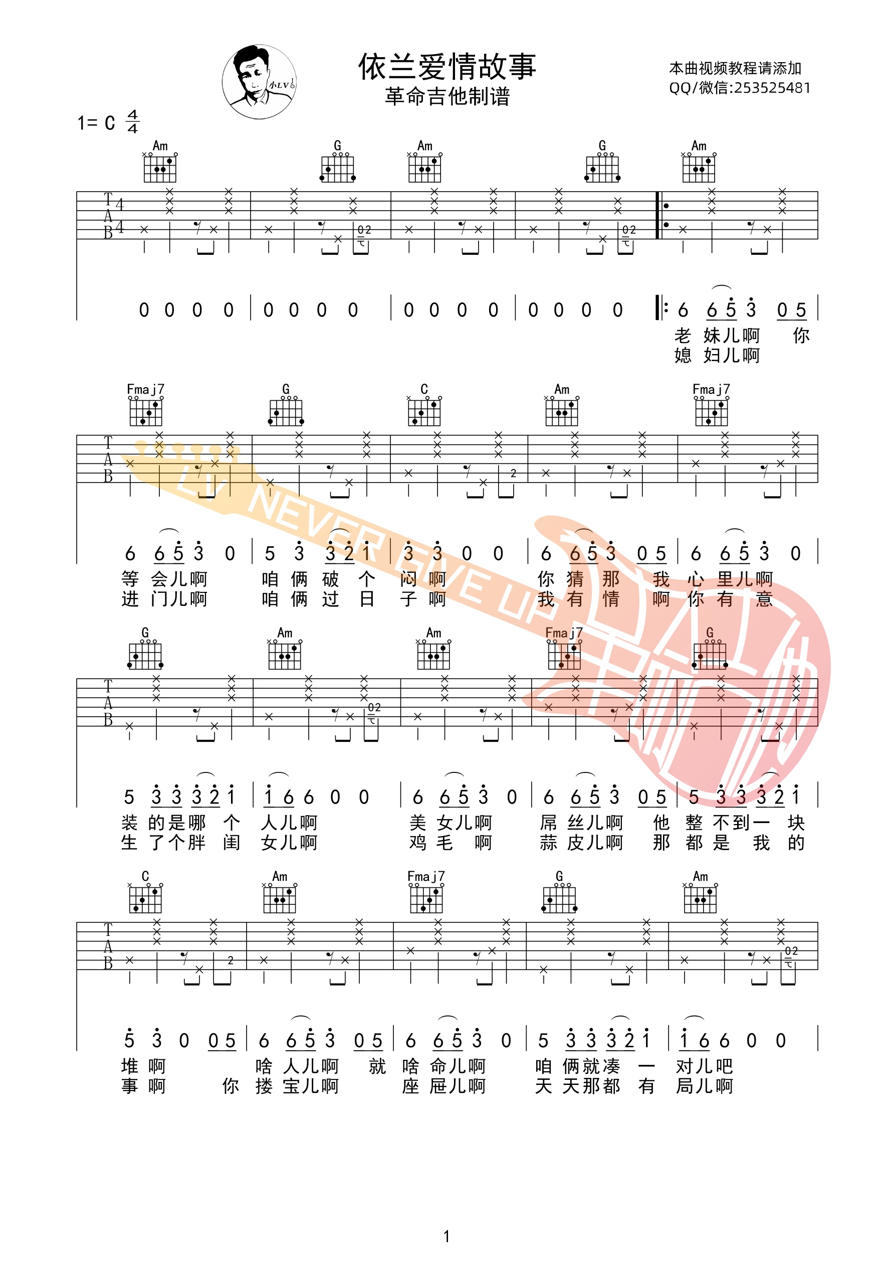 方磊《依兰爱情故事》吉他谱C调附前奏...