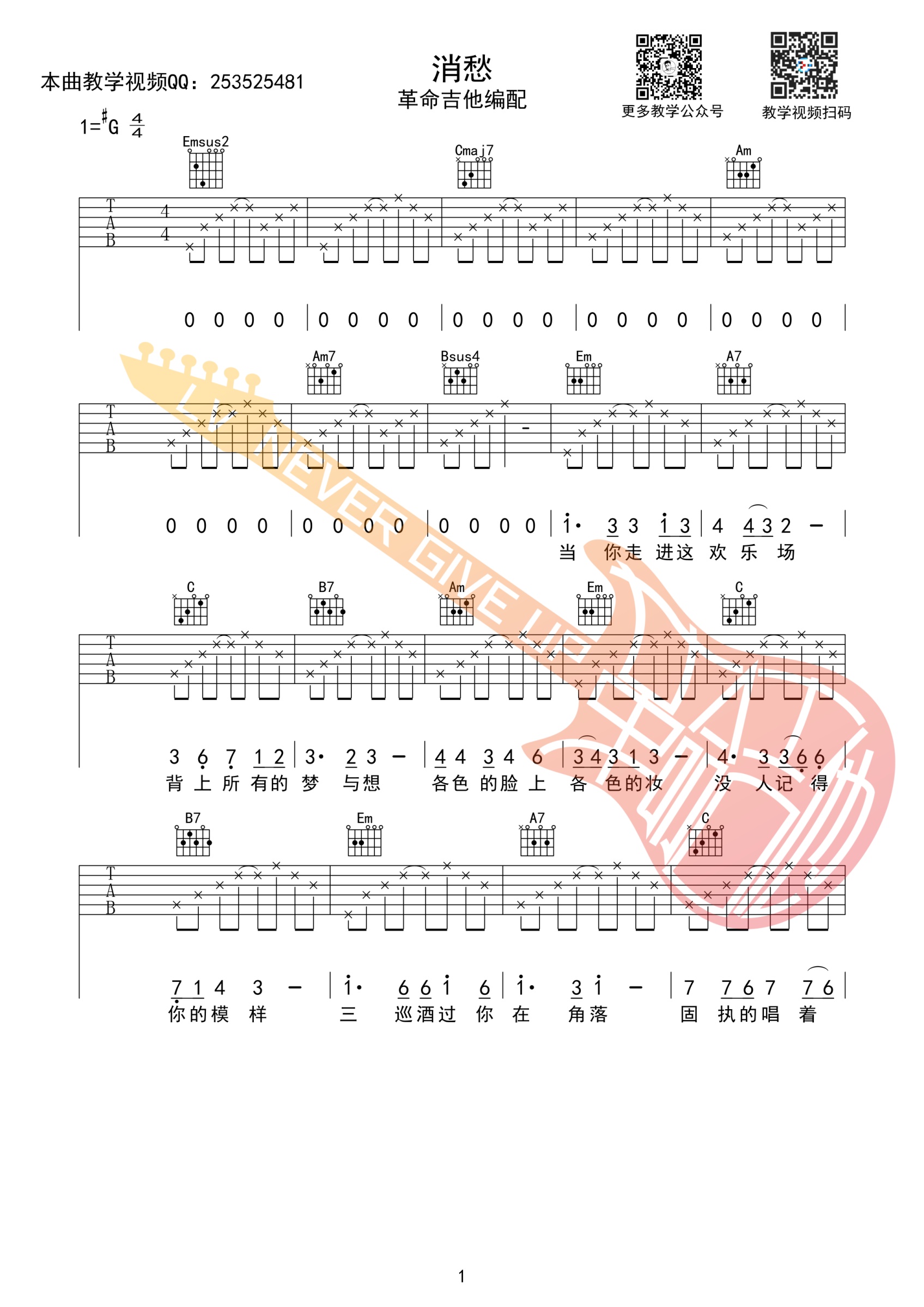 毛不易《消愁》吉他谱G调简单版...