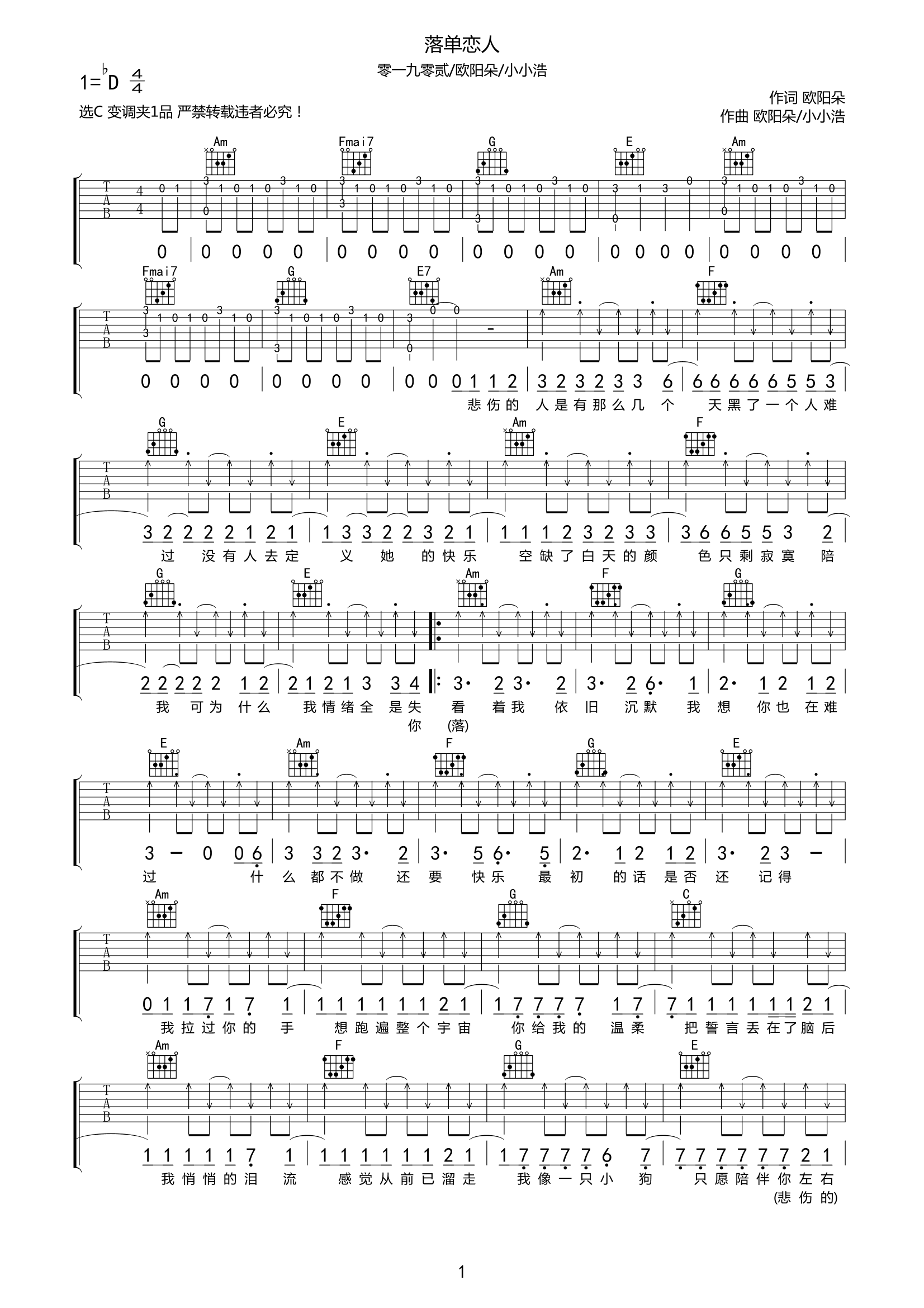 零一九零贰《落单恋人》吉他谱-C调六线谱弹唱谱...