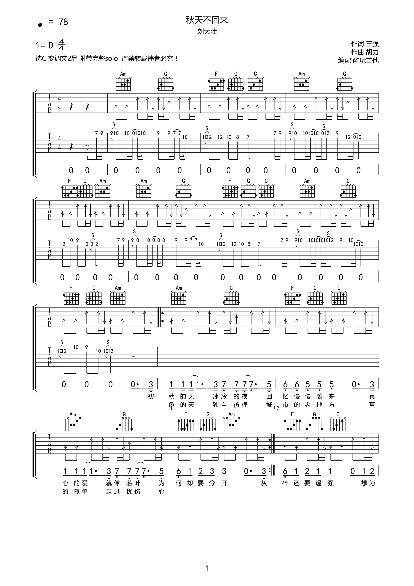 吉他刘大壮《秋天不回来》吉他谱-C调六线谱弹唱谱