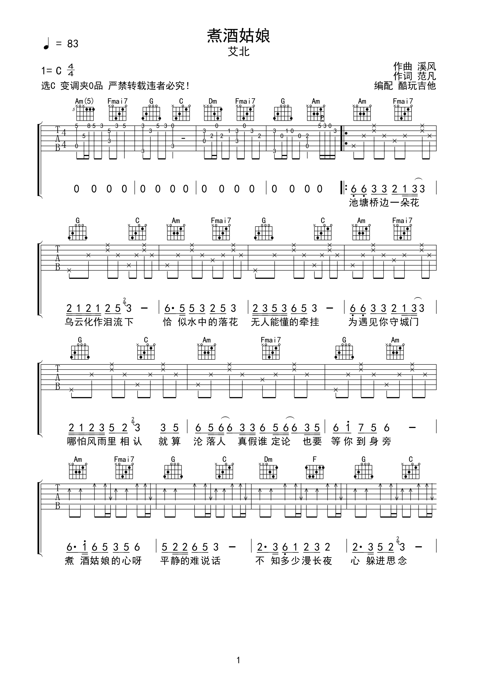 艾北《煮酒姑娘》吉他谱-C调六线谱弹唱谱...