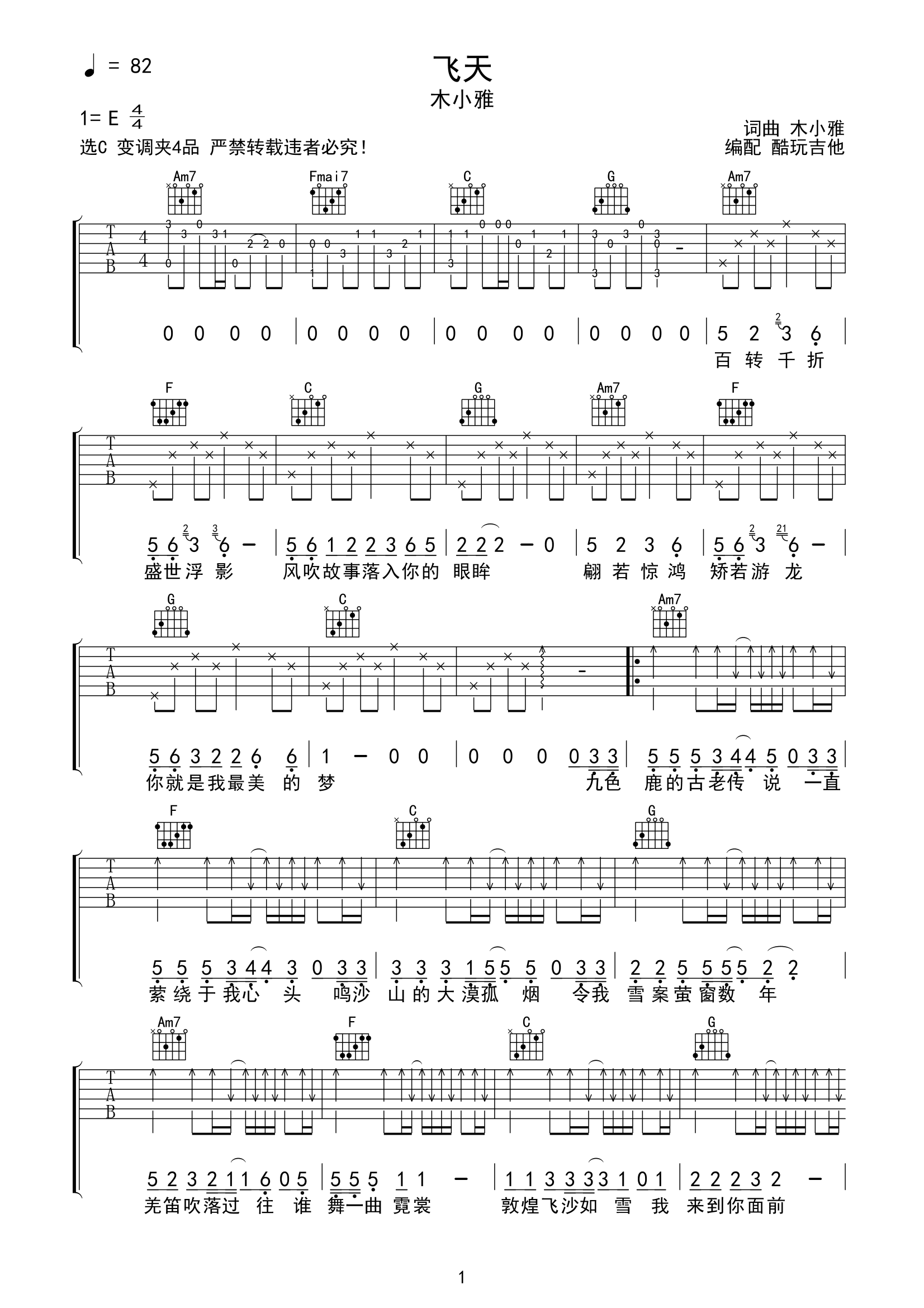 木小雅《飞天》吉他谱-C调六线谱弹唱谱...