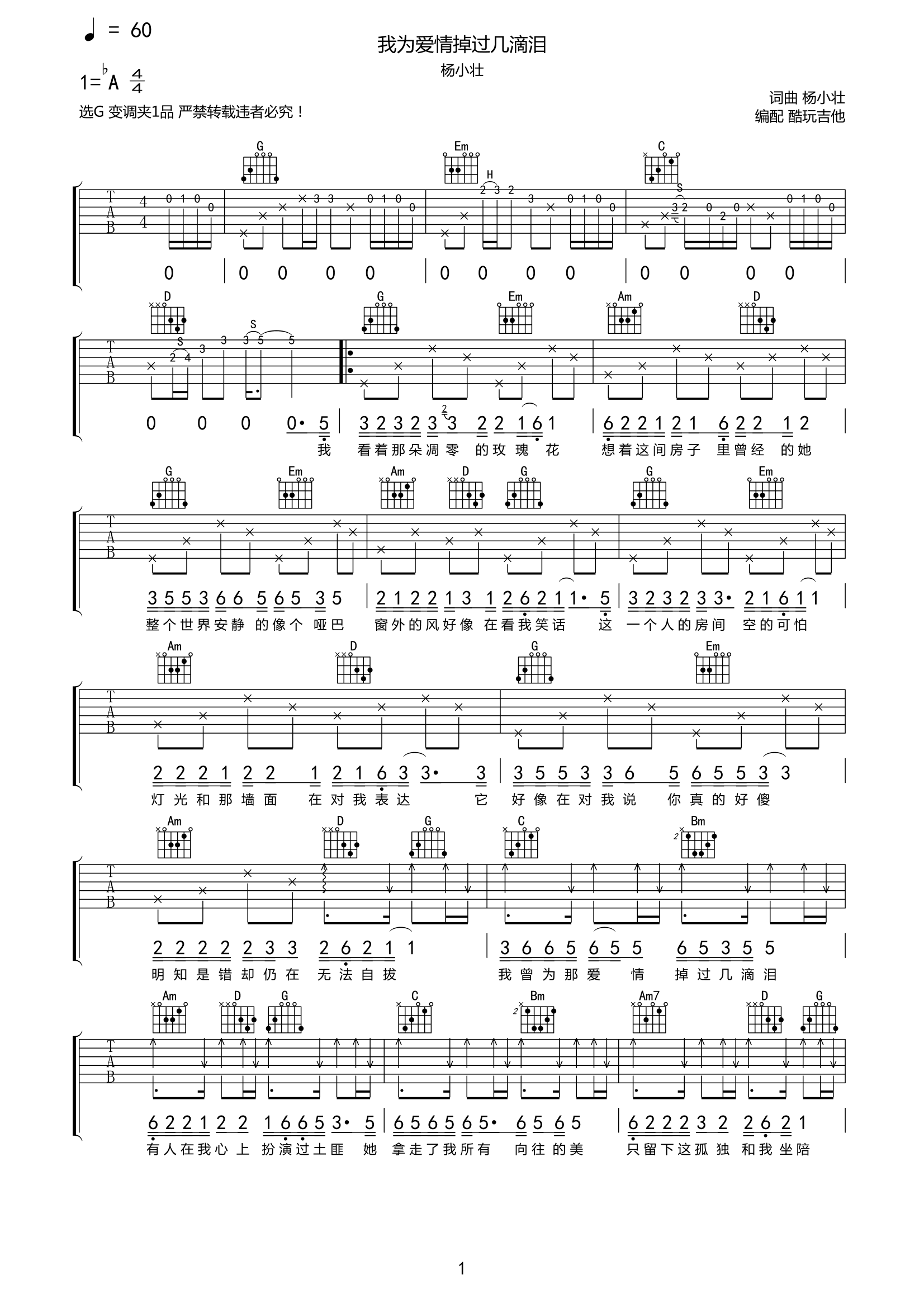 杨小壮《我为爱情掉过几滴泪》吉他谱-G调六线谱弹唱谱...
