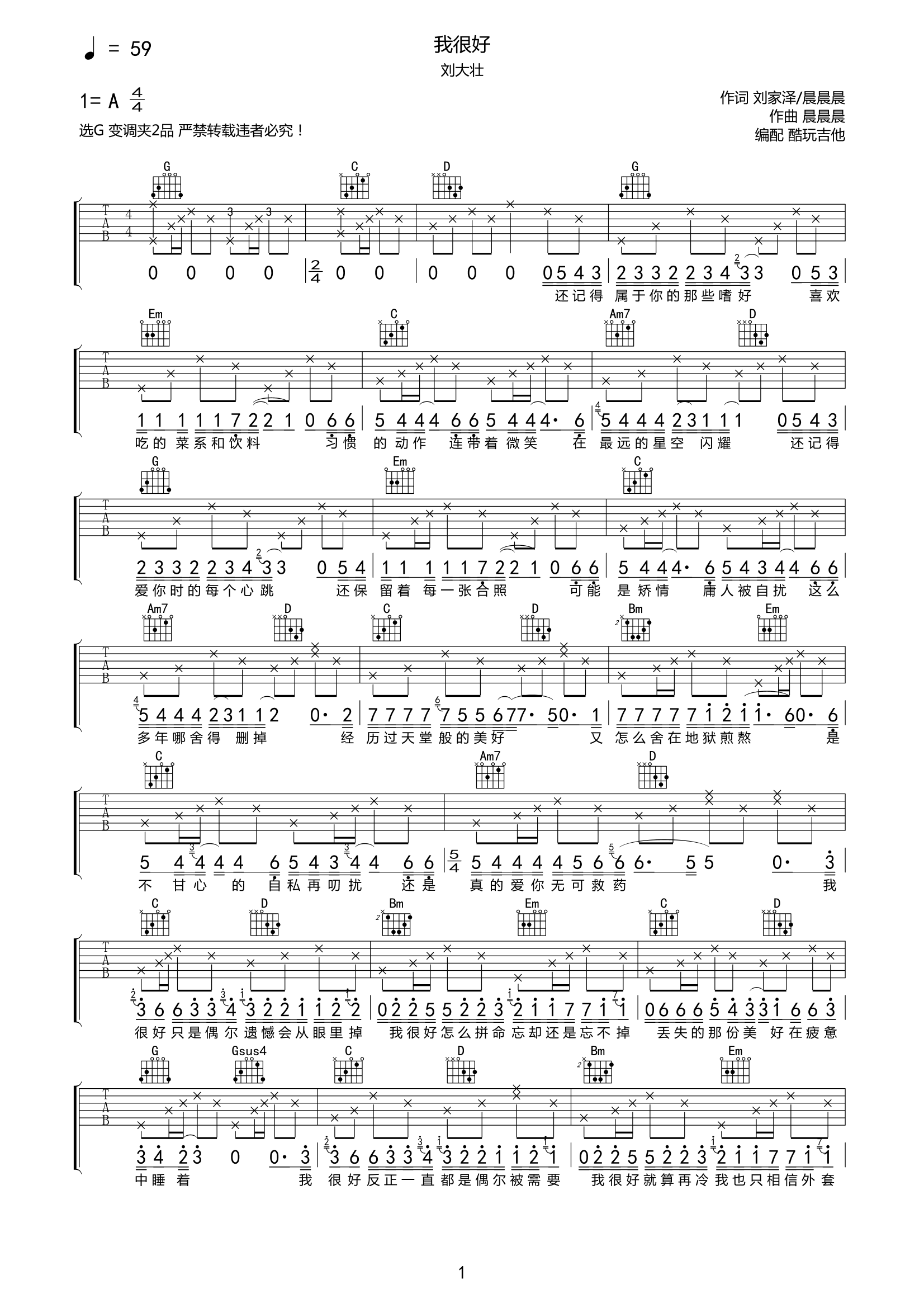 吉他刘大壮《我很好》吉他谱-G调六线谱弹唱谱