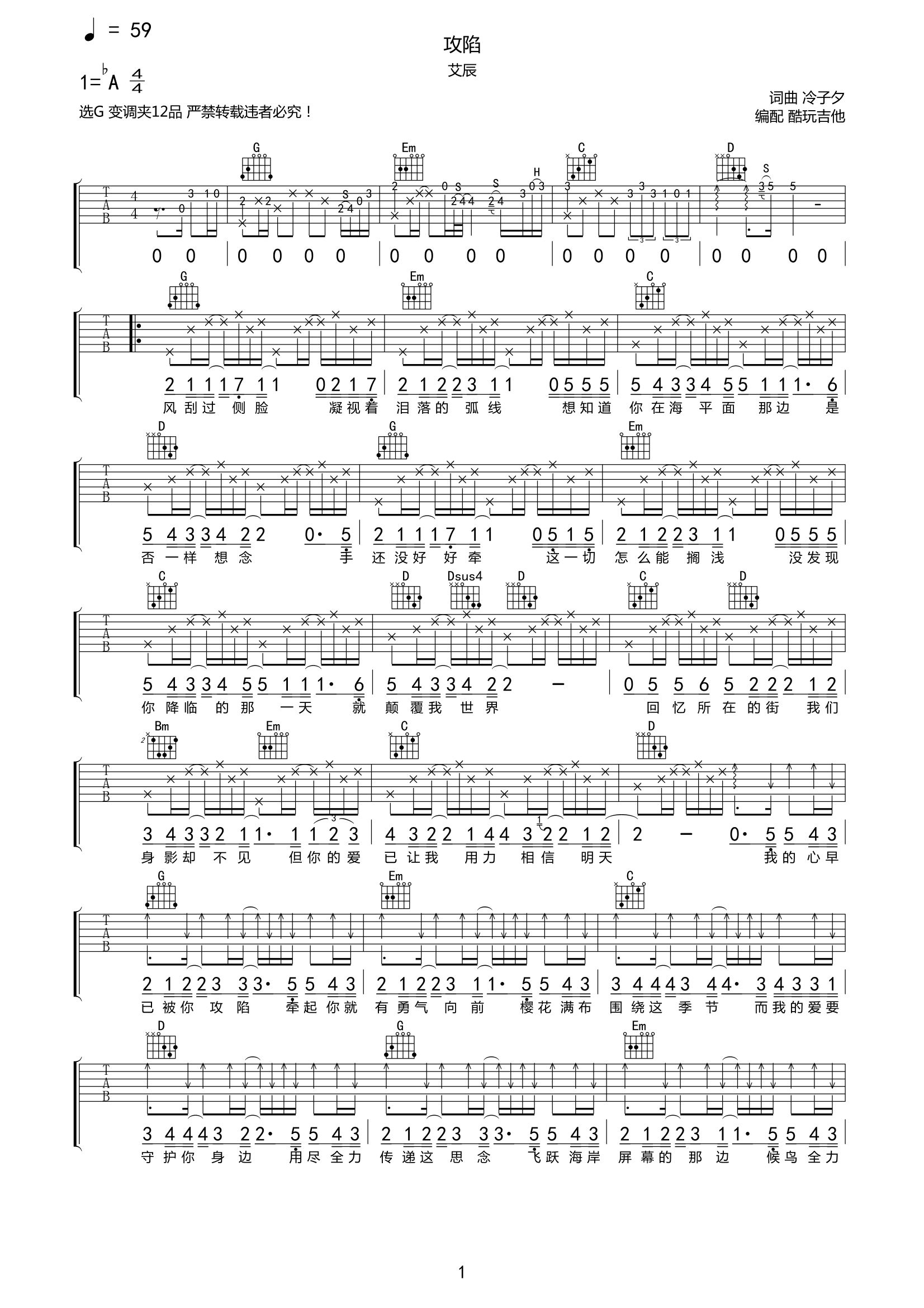 吉他艾辰《攻陷》吉他谱-G调六线谱弹唱谱