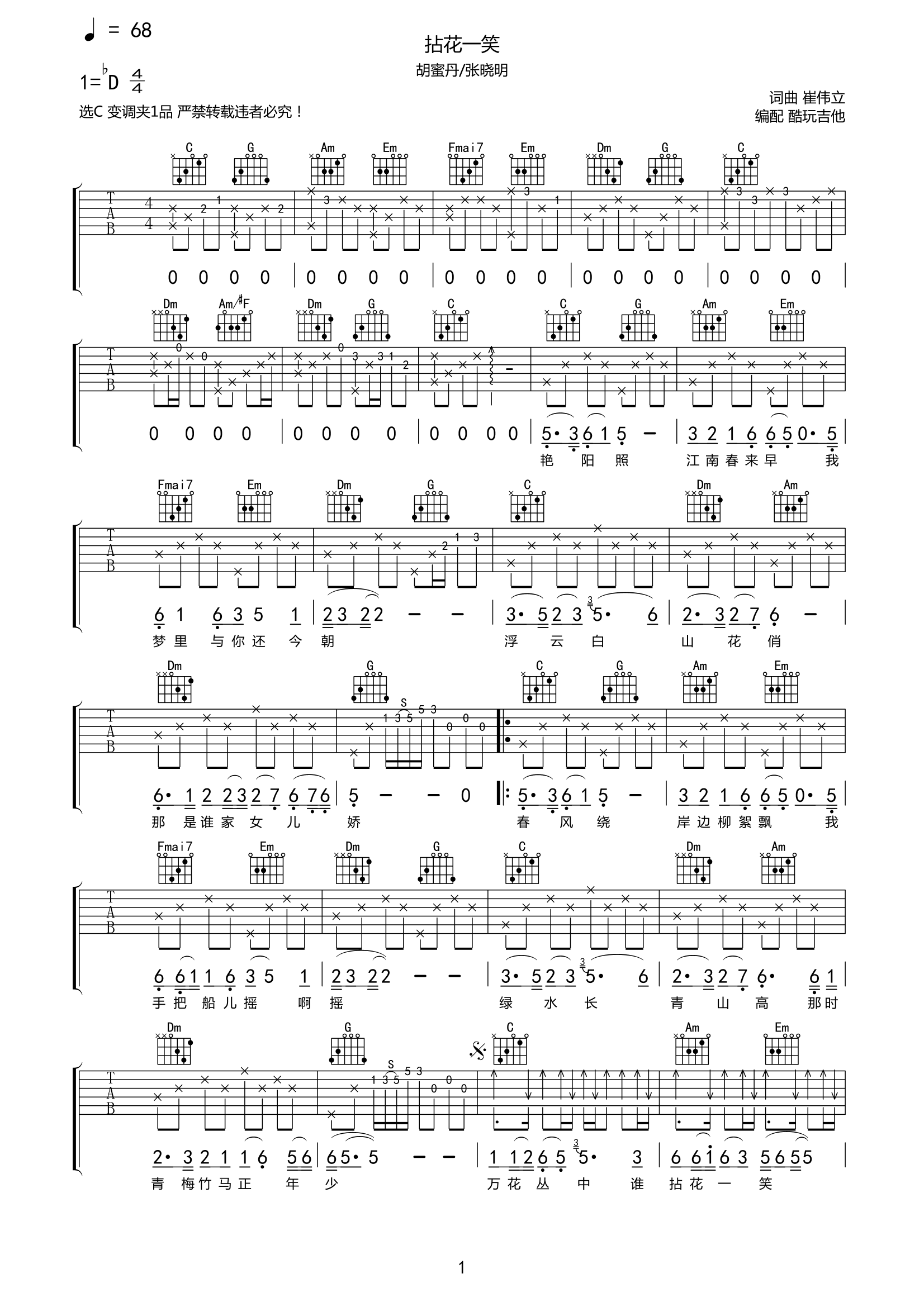 张晓明《拈花一笑》吉他谱-C调六线谱弹唱谱...