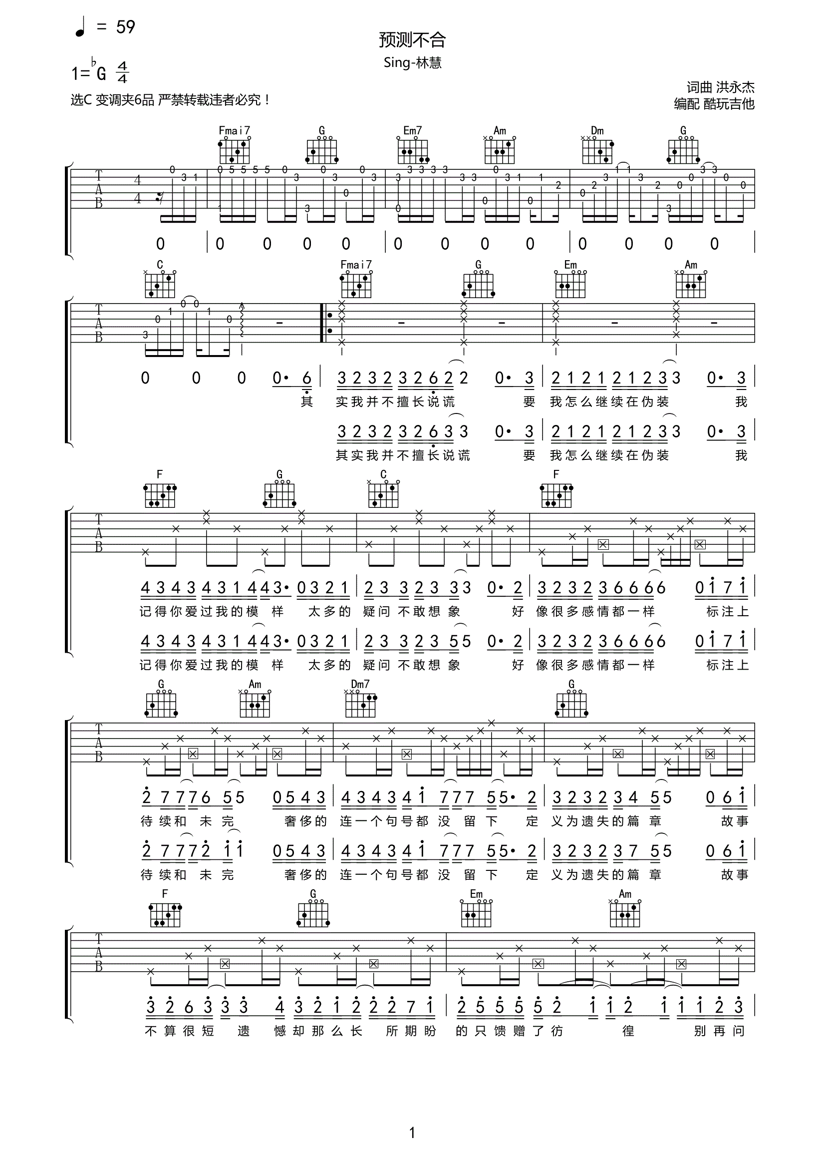 吉他Sing 林慧《预测不合》吉他谱-C调六线谱弹唱谱