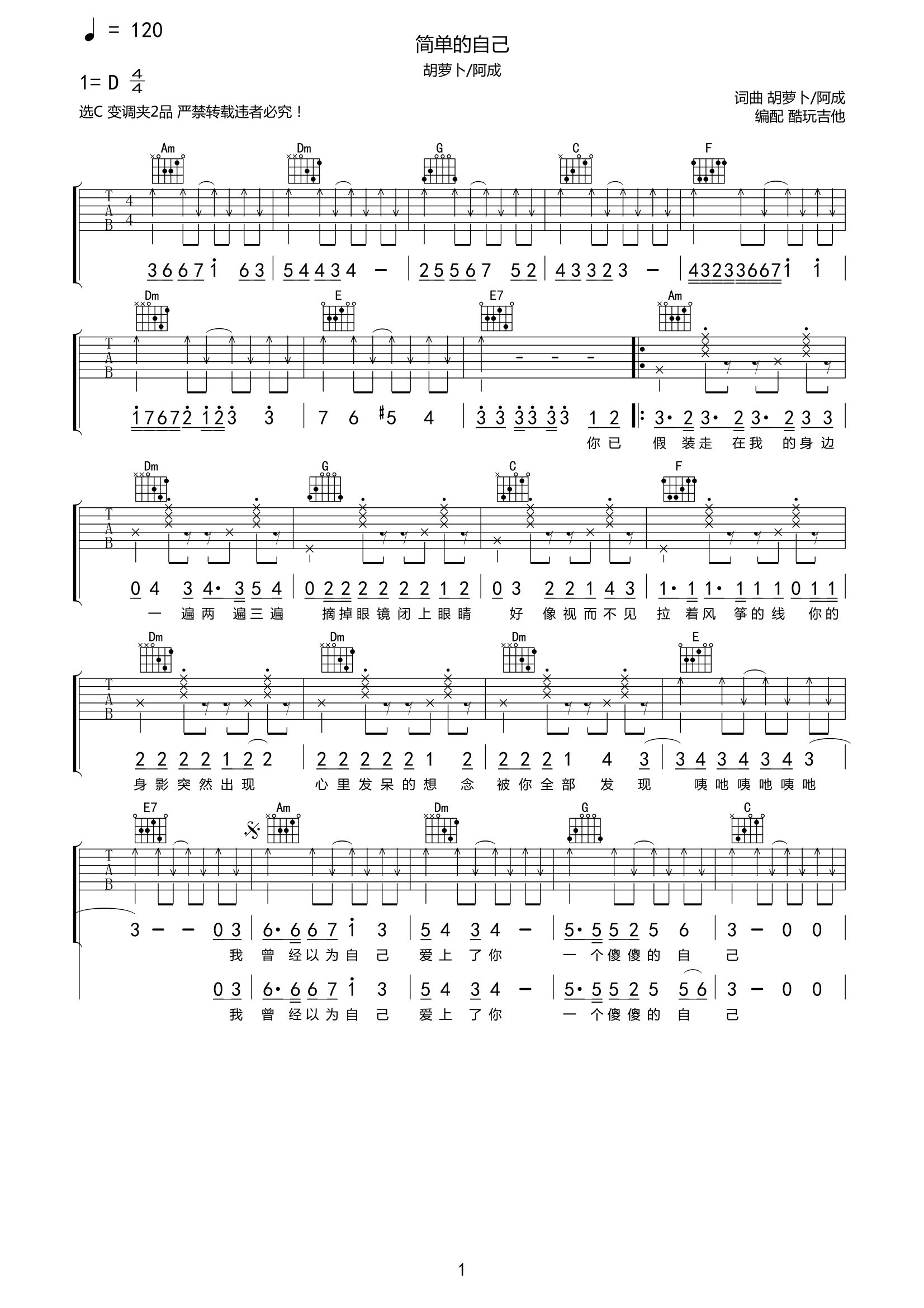 胡萝卜/阿成尹《简单的自己》吉他谱-C六线谱弹唱谱...
