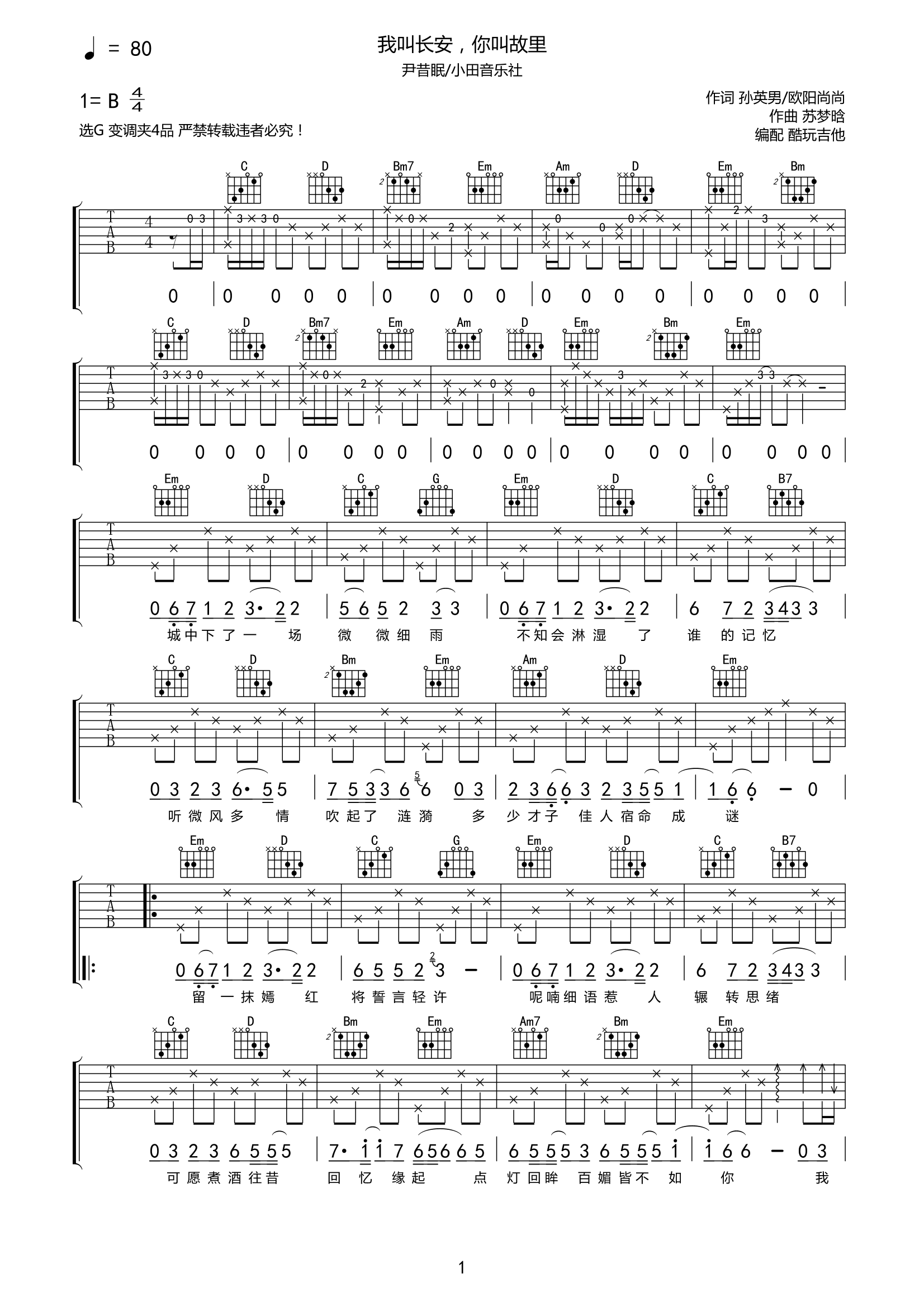 尹昔眠/小田音乐《我叫长安,你叫故里》吉他谱-G六线谱弹唱谱...