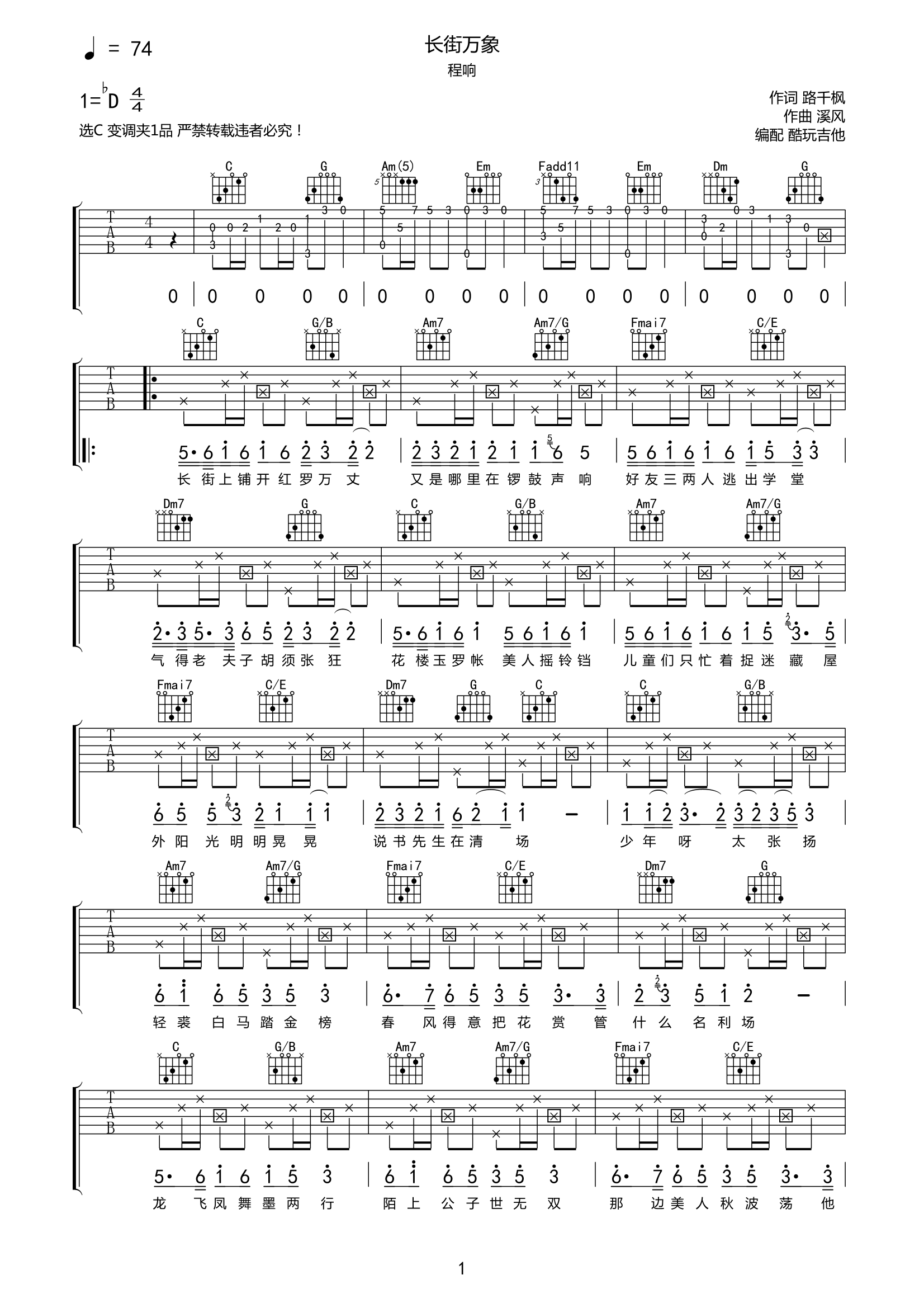 吉他程响《长街万巷》吉他谱-C六线谱弹唱谱