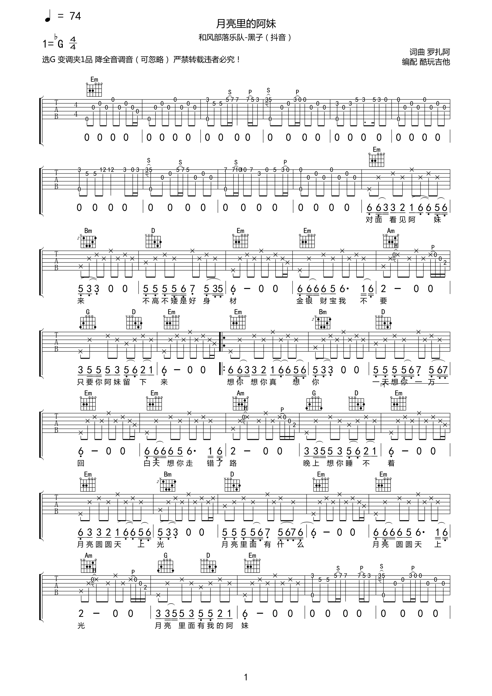 吉他黑子《月亮里的阿妹》吉他谱-G六线谱弹唱谱