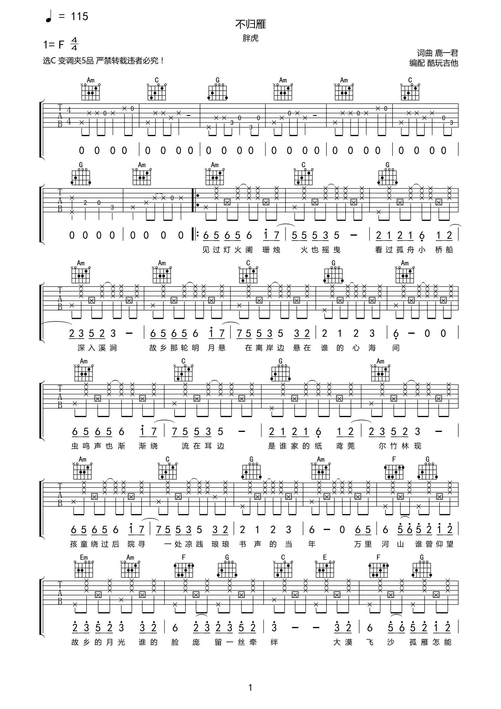 吉他胖虎《不归雁》吉他谱-G六线谱弹唱谱