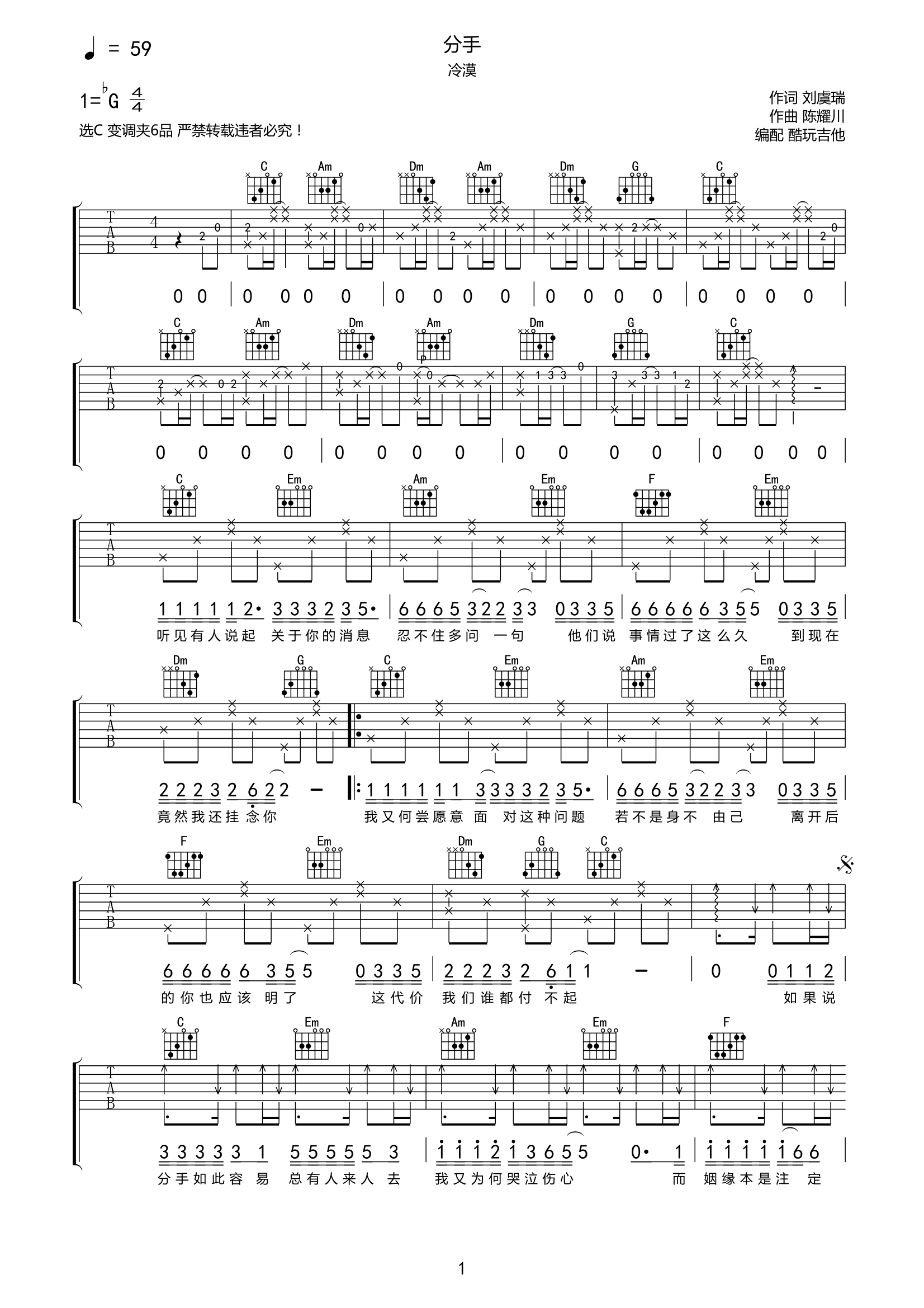 冷漠《分手》吉他谱-C六线谱弹唱谱...