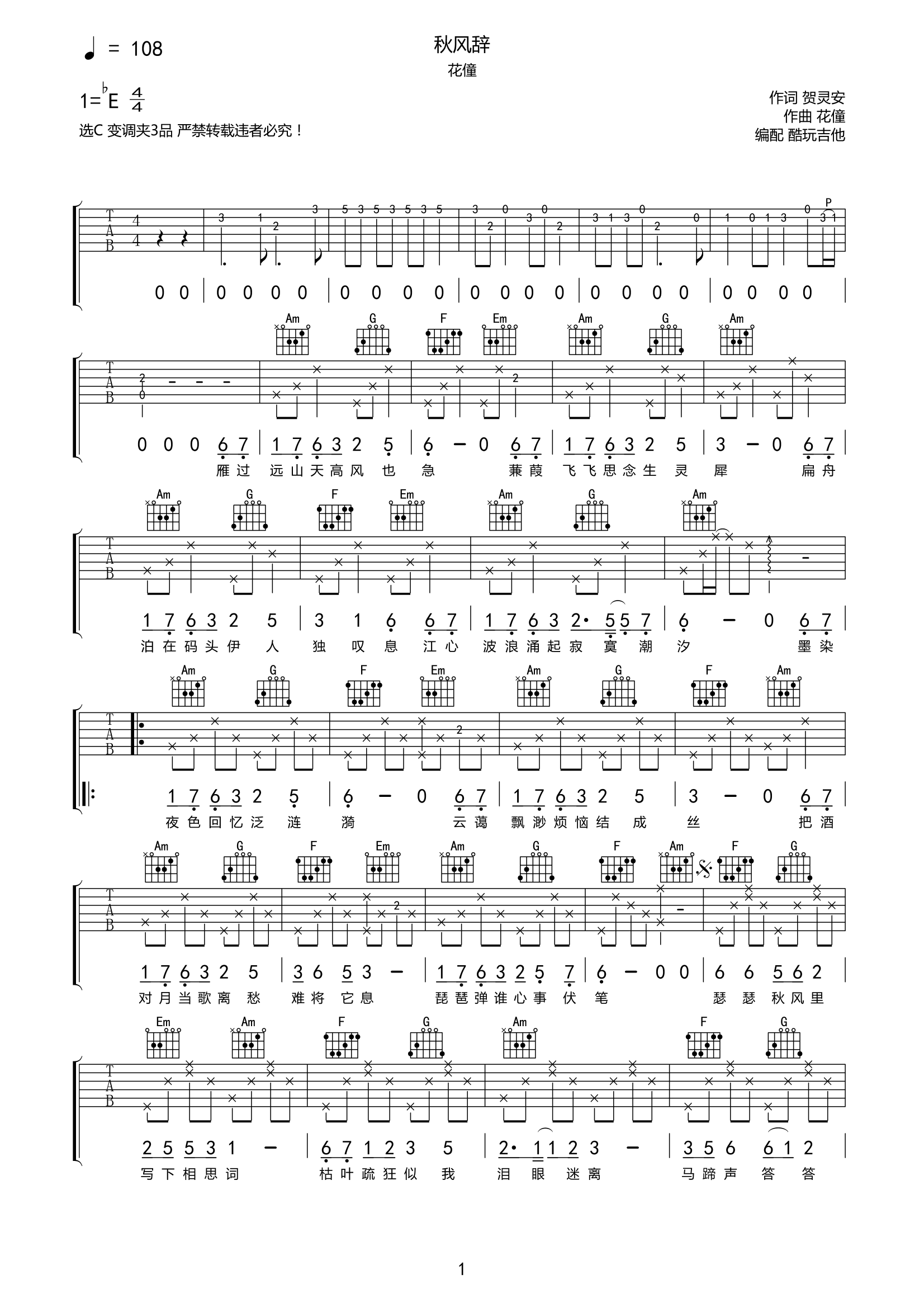 花僮《秋风辞》吉他谱-C六线谱弹唱谱...