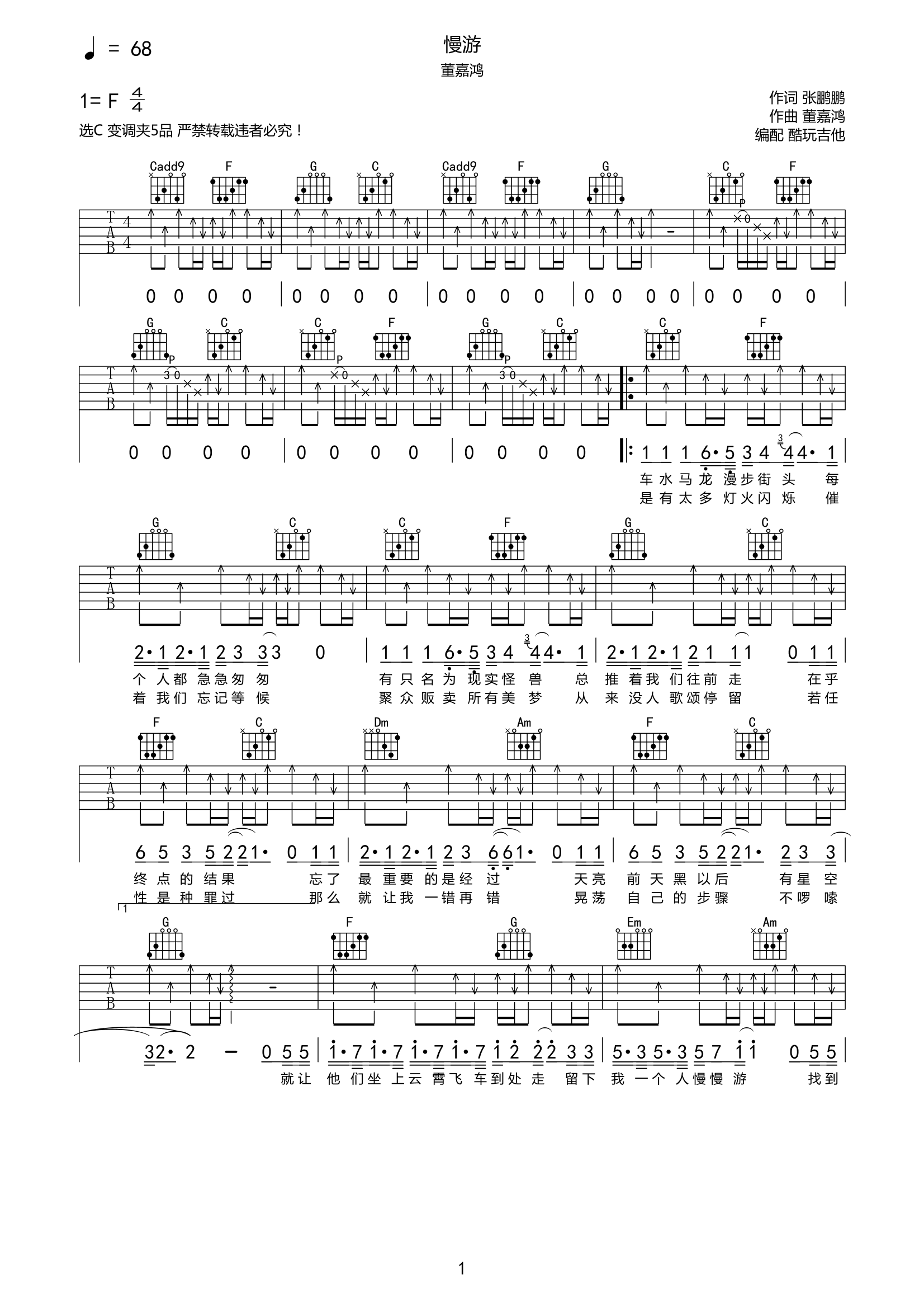 董嘉鸿《慢游》吉他谱-C六线谱弹唱谱...