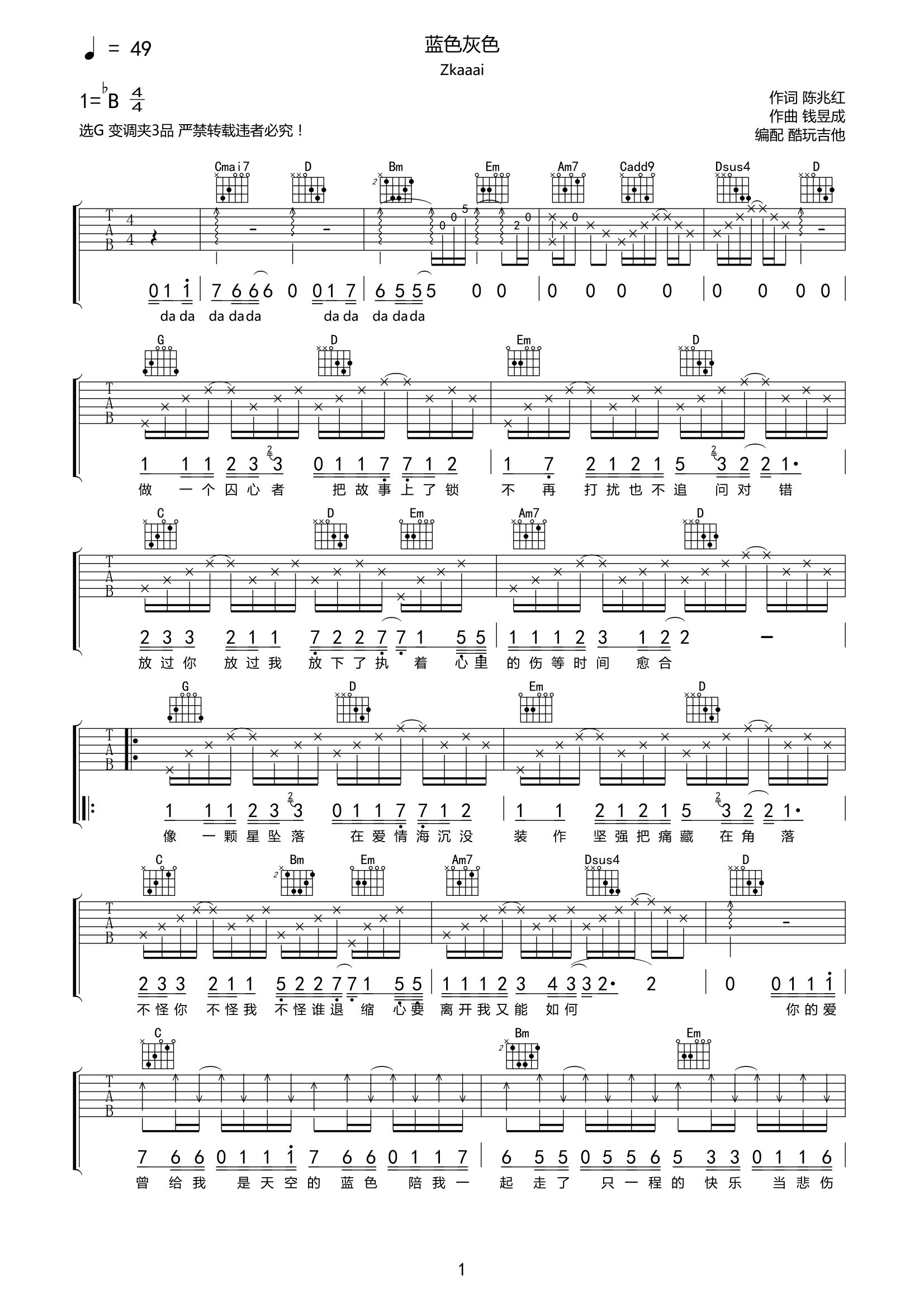吉他zkaaai《蓝色灰色》吉他谱-G六线谱弹唱谱