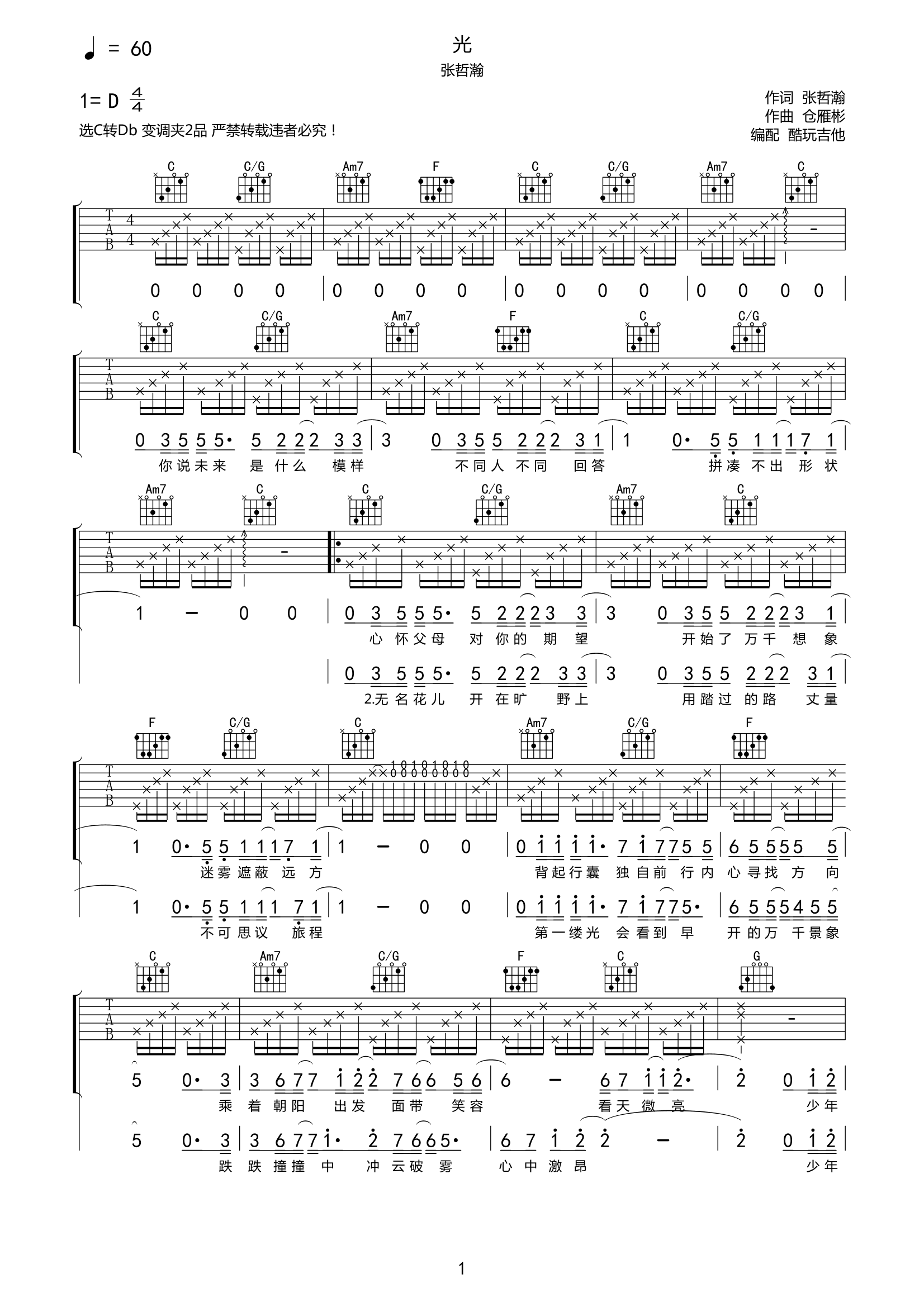 吉他张哲瀚《光》吉他谱-C六线谱弹唱谱
