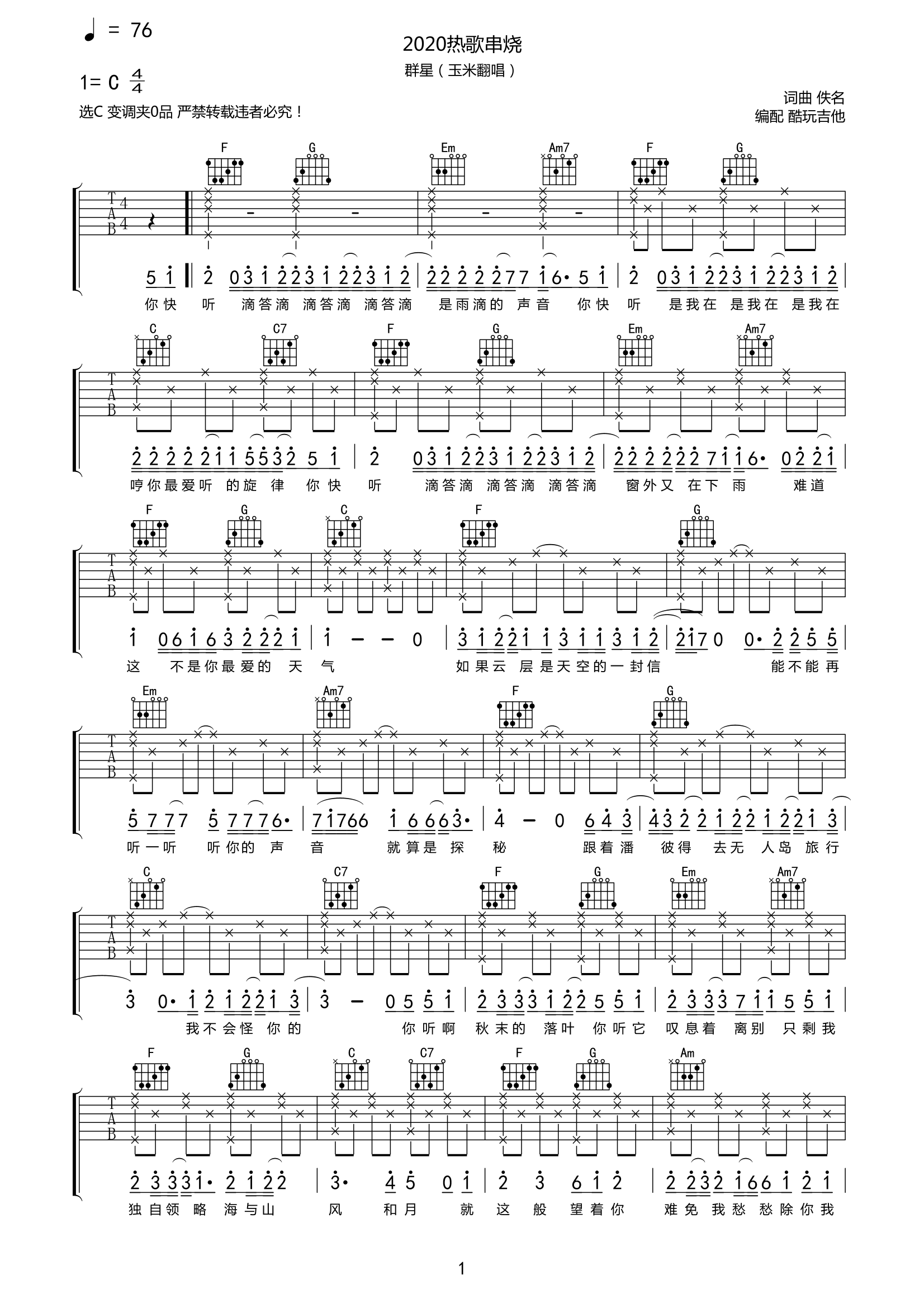 玉米翻唱《2020热歌串烧》吉他谱-C六线谱弹唱谱...