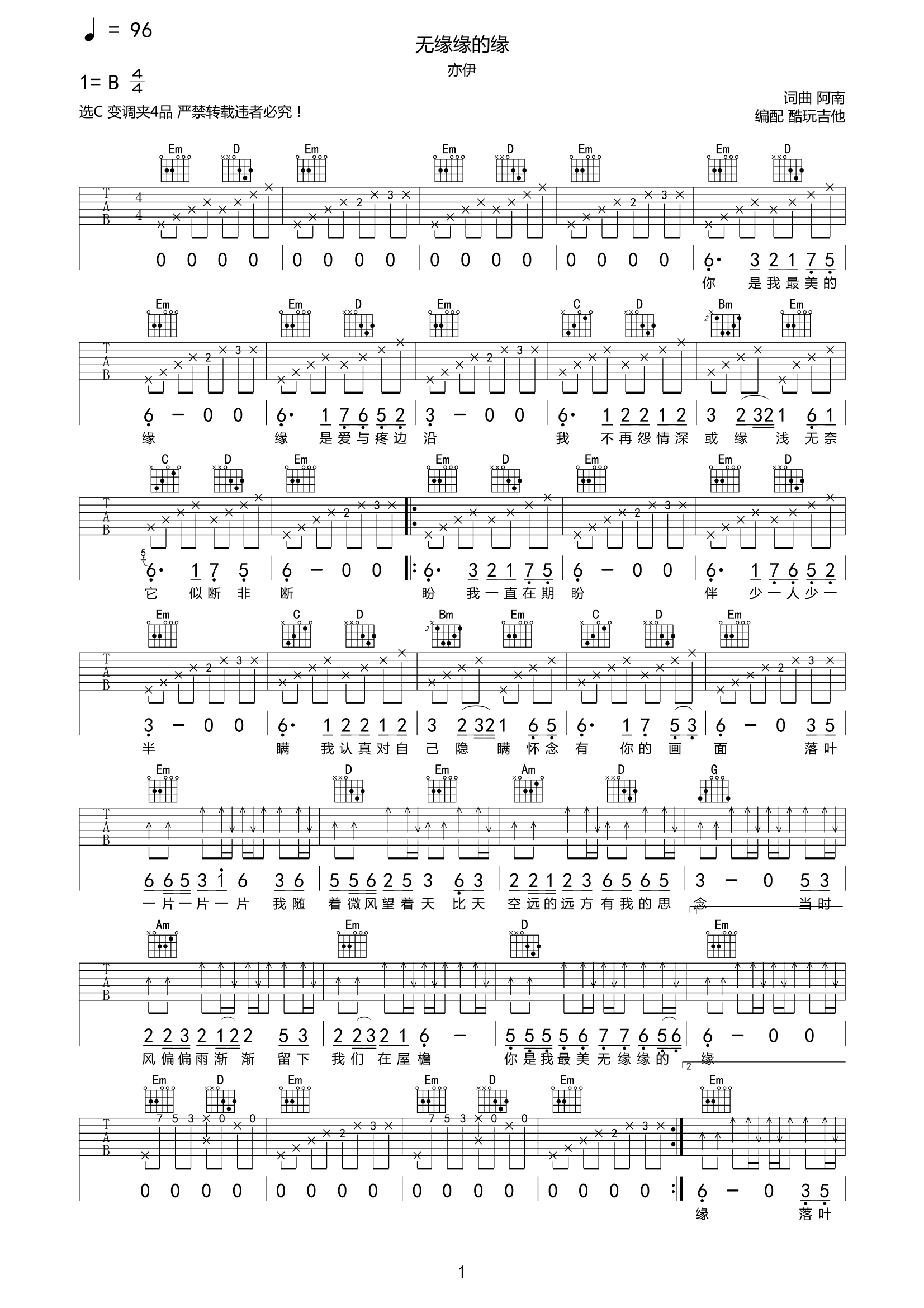 吉他亦伊《无缘缘的缘》吉他谱-C六线谱弹唱谱