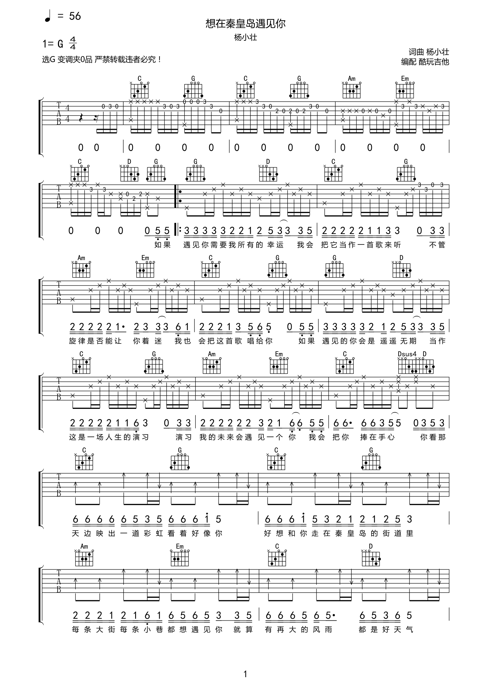 吉他杨小壮《想在秦皇岛遇见你》吉他谱-G六线谱弹唱谱