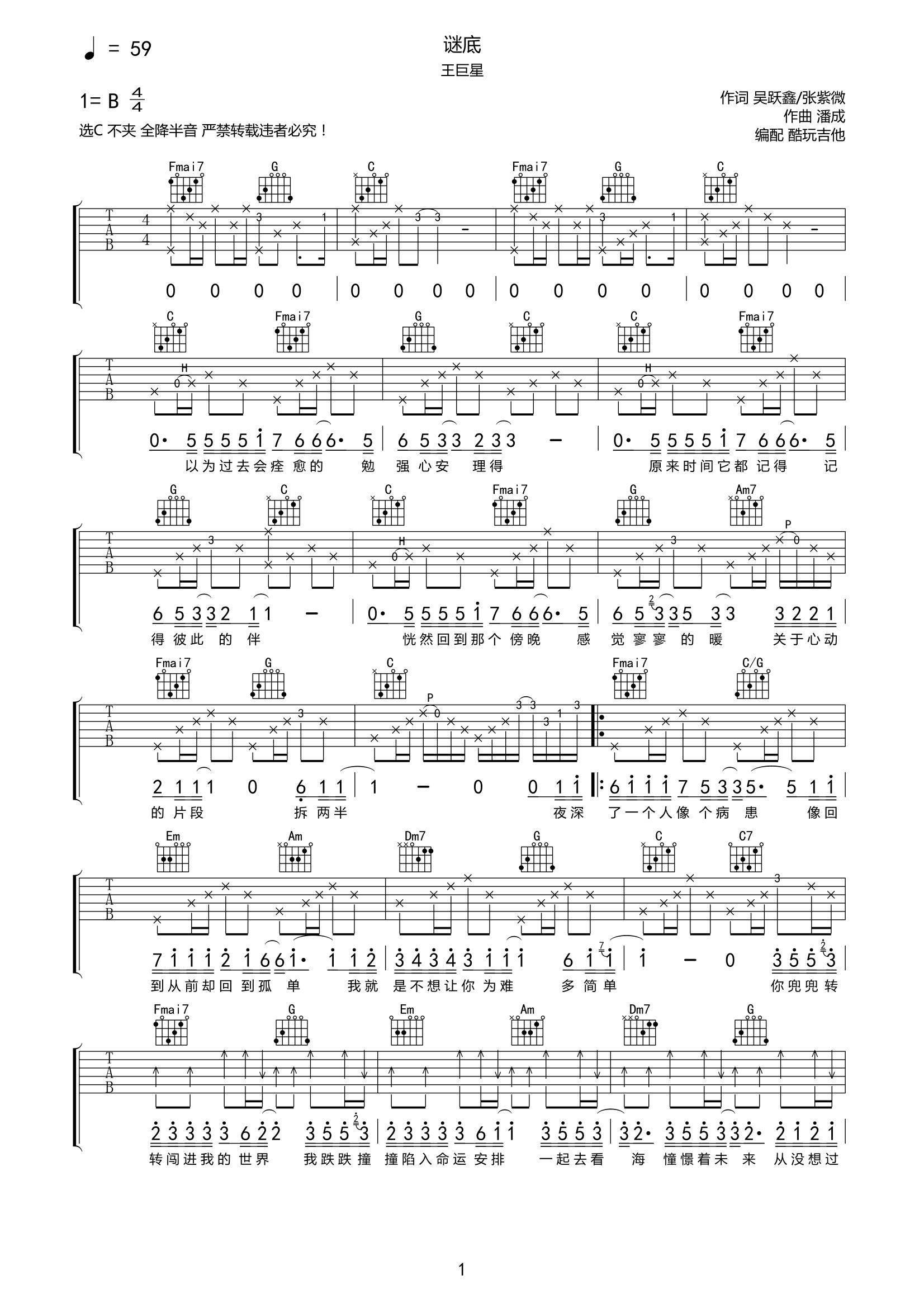 王巨星《谜底》吉他谱-C六线谱弹唱谱...