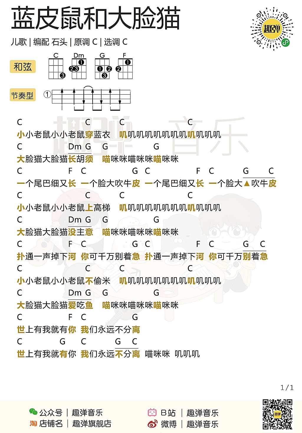 《蓝皮鼠和大脸猫》尤克里里谱-C调和弦弹唱版...