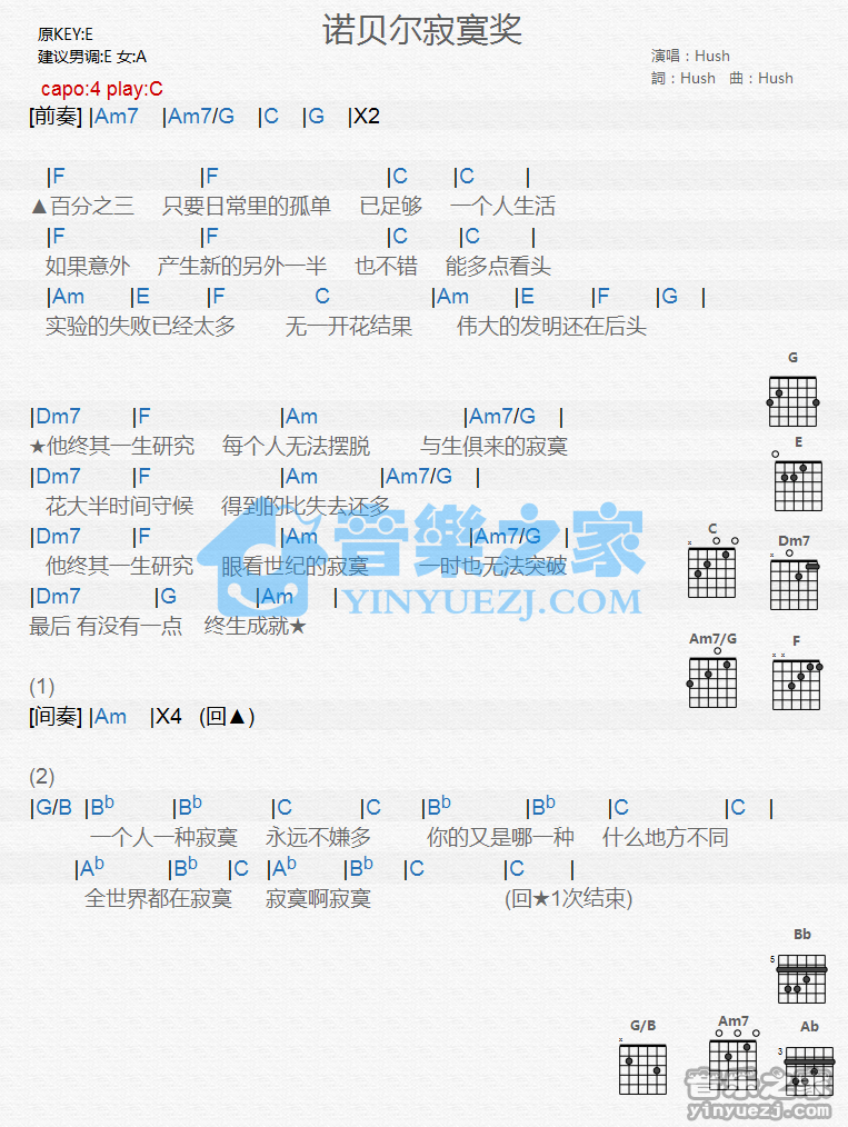 吉他Hush《诺贝尔寂寞奖》吉他谱_吉他弹唱谱_YYZJ编配