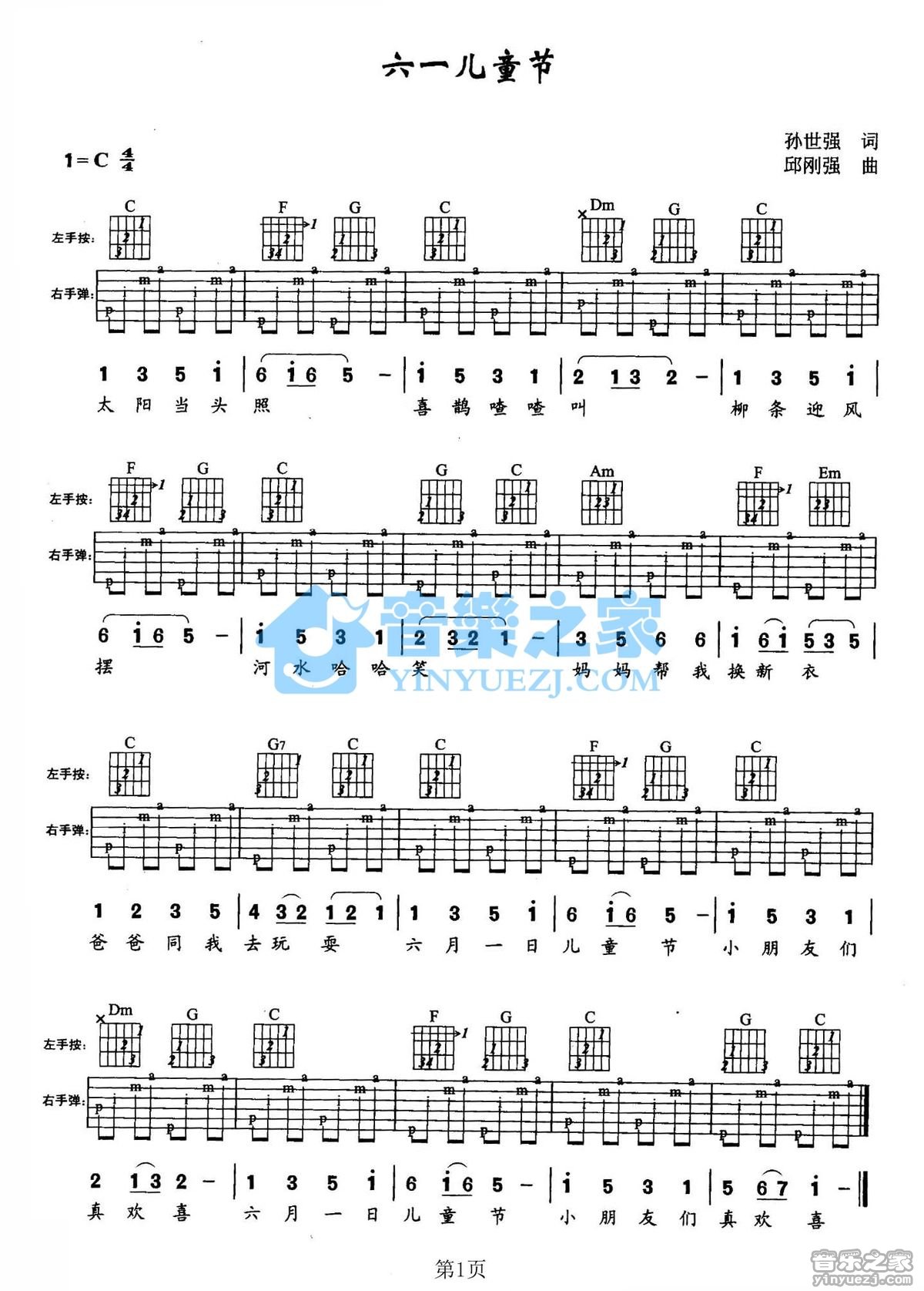 C调版儿歌《六一儿童节》吉他弹唱六线谱...