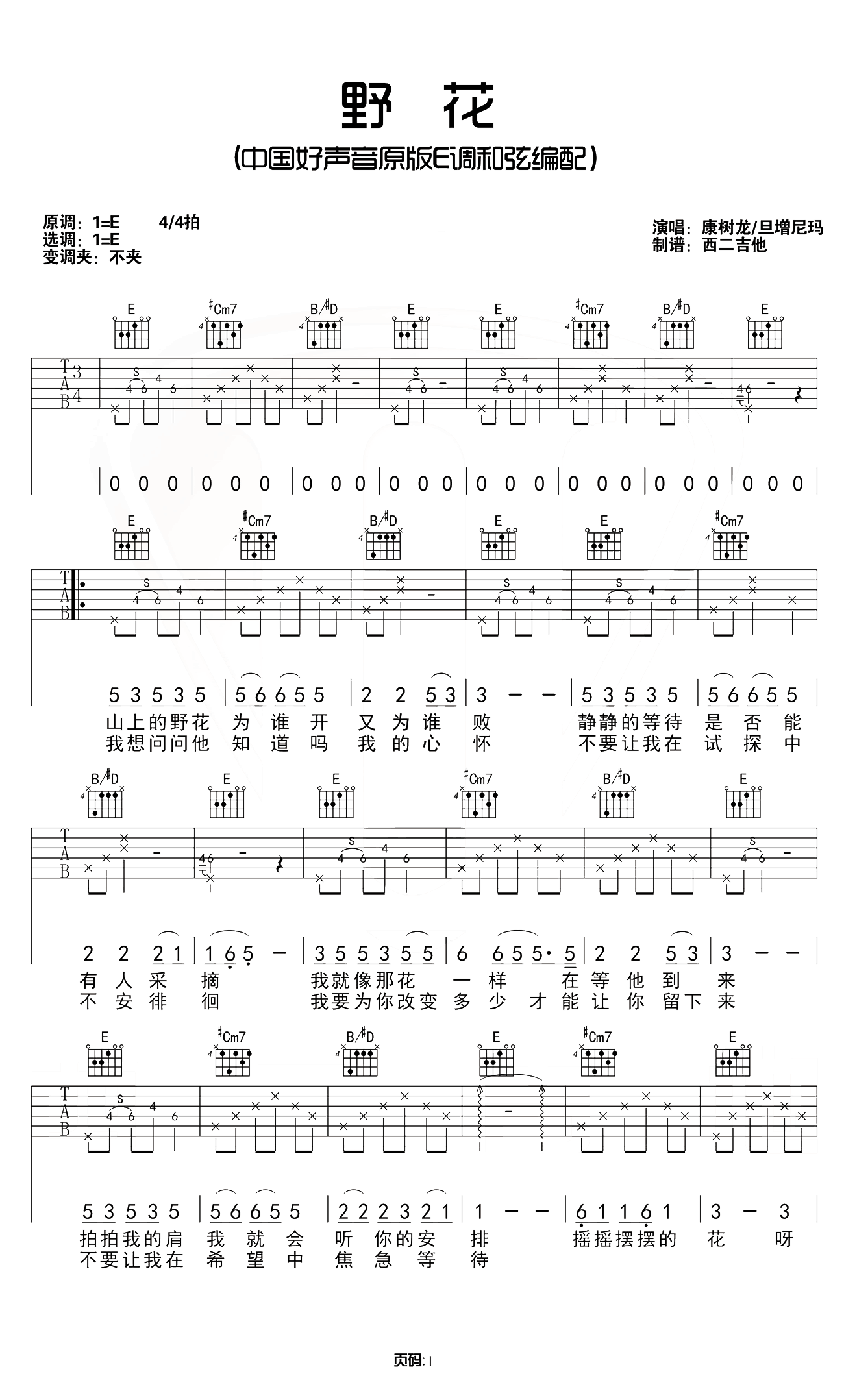 野花吉他谱,《中国好声音》康树龙/旦增尼玛演唱,柔美搭悲情超好听,野花吉他弹唱谱,E调和弦原版编配,不需要变调夹,田震的一首经典老歌,《2018中国好声音》第六期,李健组选手康树龙和旦增尼玛合唱了这首歌曲,一个深沉沧桑,一个柔美空灵,两个不同的风格赋予这首经典不一样的味道。...