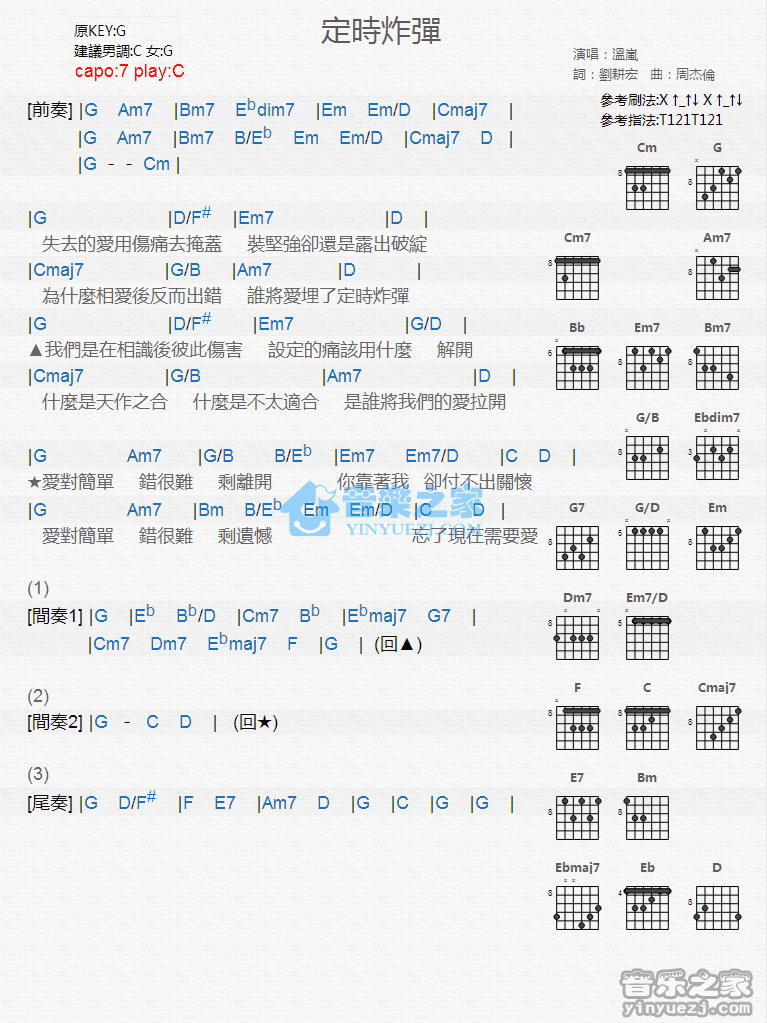 C调版温岚《定时炸弹》吉他和弦弹唱谱...