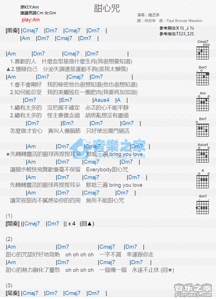 Am调版杨丞琳《甜心咒》吉他和弦弹唱谱...