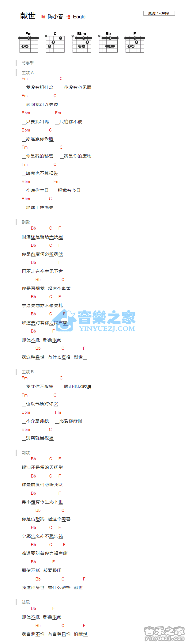 陈小春《献世》吉他和弦弹唱谱...